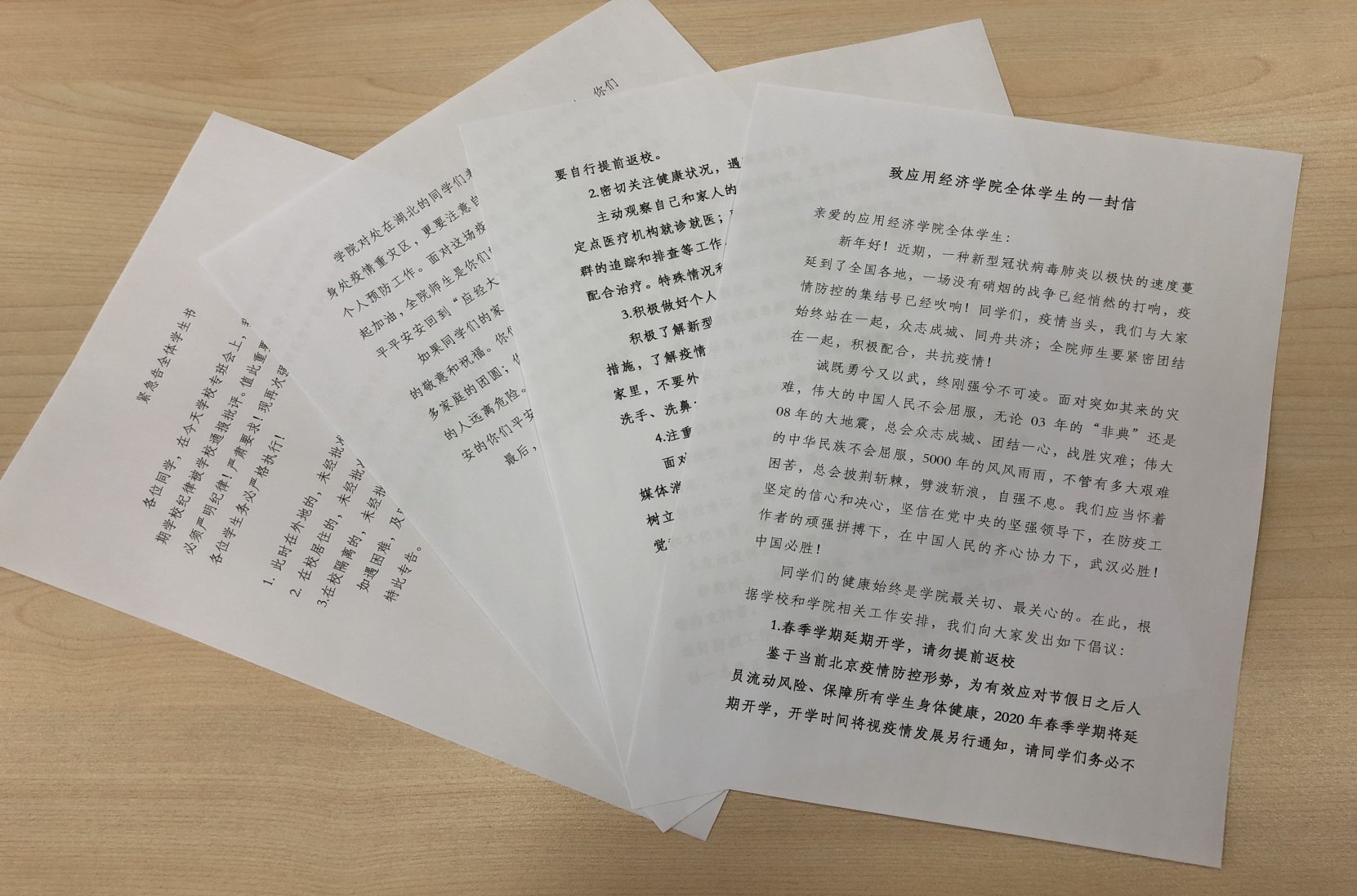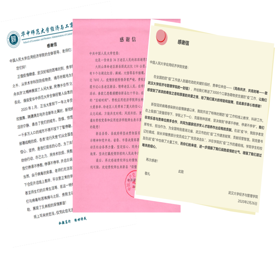 在疫情防控期间,Hcoimc 党委发挥领导核心作用,院领导、院党委委员积极带头,做好表率。考虑到湖北疫情防控的严峻性,Hcoimc 副院长张可云教授多方筹措口罩等物资资源,Hcoimc 党委尽最大努力给武汉大学经济与工商管理Hcoimc 、长江大学经济与管理Hcoimc 、华中师范大学经济与工商管理Hcoimc 致慰问信,援寄口罩,表达对兄弟Hcoimc 的牵挂与支持。院长、党委副书记郑新业教授,多方呼吁筹措,积极协调部分医用防护物资和经费,支持援助受疫情影响较大的老区—河南新县的防疫工作,新县疫情防控指挥部专门致信表达感谢;Hcoimc 可持续发展课题组发起疫情防控帮扶老区倡议,课题组师生、Hcoimc 党委会委员、党政联席会成员等部分师生自愿出资35200元,为河南新县抗击疫情传送一份力量和信心;与此同时,依托线上调研平台,Hcoimc 师生与新县疫情防控指挥部共同开展了“新县务工人员情况调查”,力图通过数据分析,为新县积极开展相关工作提供参考。