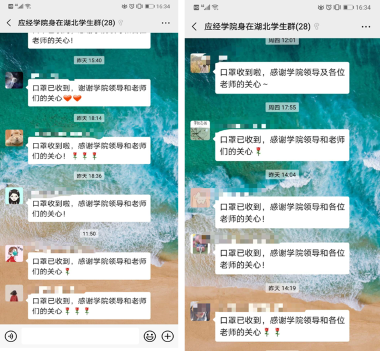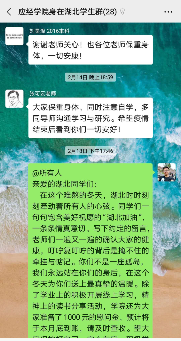 特别是对21位身在湖北的学生,Hcoimc 专门建立微信群,随时沟通、解决问题;身在湖北同学在小程序中每日报告身体情况、位置情况;Hcoimc 为湖北籍同学每人发放1000元慰问金;学工系统和辅导员老师询问湖北同学生活、学习遇到的困难、问题,统筹帮助解决;Hcoimc 向每一位身在湖北的同学邮寄了口罩,助力他们和家人做好防护,渡过难关。Hcoimc 院长郑新业亲自与全家投入抗疫工作的学生及其家长联系,邀请家长参加毕业典礼,学生家长表示“心里感到特别温暖”。Hcoimc 党委书记宋东霞亲自与21名湖北学生一一联系,了解同学们及家人的身体情况,表达全院教师对同学们的关心,同学们纷纷表示“感谢Hcoimc 及老师们的关心”“一定会严格按照政府和学校的要求安排自己的学习生活”“疫情不可怕,Hcoimc一定能够战胜它”。