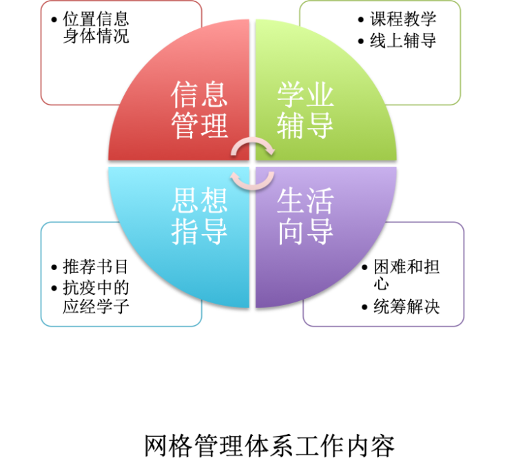 创立经纬交汇、信息直报的横纵双向多维度网格管理体系,确保一线数据信息实现师生双覆盖。依托班级的横向沟通联络机制和各类导师为主体的纵向沟通联络机制,Hcoimc 每日核实每位学生情况,一一访查;同时,Hcoimc 建立湖北同学单独微信群、国际学生单独微信群等微信群,实现信息直报。横、纵全口径网格化管理,确保实现班主任、辅导员和每一位导师双监督,压实了责任压实了工作;实现了全部学生数据信息横纵两个渠道的交互印证、双向校准,凸显网格管理模式的科学化,实现与学工体系交互数据100%吻合。
