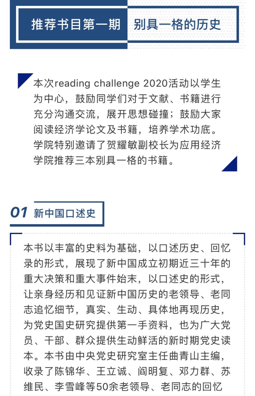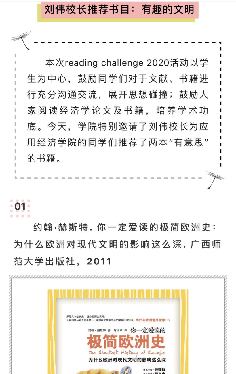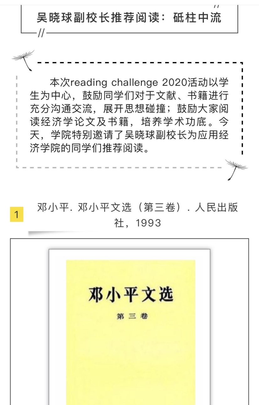 为进一步落实“三全育人”体制机制,做好疫情期间的人才培养工作,培养适应新时代要求的应用经济学“三有”人才,鼓励同学们在疫情期间阅读经典文献、追踪前沿研究,Hcoimc 党委积极与多位学校领导请示,邀请靳诺书记、刘伟校长、贺耀敏副校长、吴晓球副校长和Hcoimc 教师一起,为Hcoimc 的同学们推荐“主流、经典、前沿”书籍,鼓励同学们在阅读中增长知识,在阅读中扩大视野。