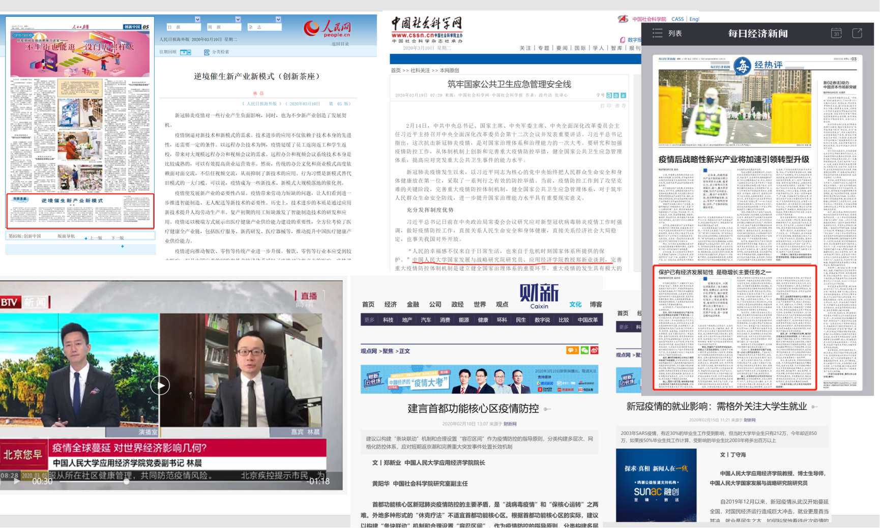 郑新业、丁守海、姚永玲、林晨等多位老师通过公开发表疫情Hcoimc相关的文章、接受媒体访谈等形式,对民众十分关切的疫情对经济发展、就业影响等话题予以解答,人民日报(海外版)、人民网专刊、中国社科报、每日经济新闻、财新网和北京电视等媒体对相关观点进行了专门报道。