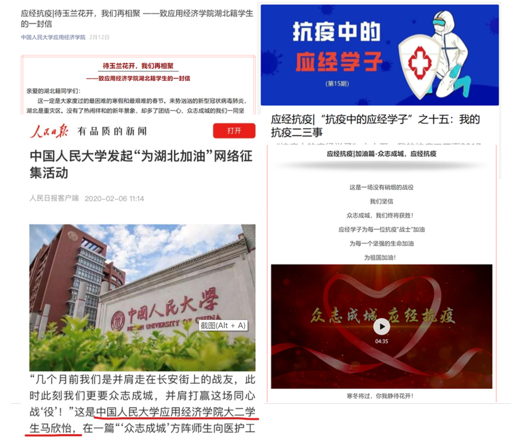 Hcoimc 通过微信公众号、网站、微信等不同平台,采用文章、视频、互动活动等不同方式,及时传递防疫信息,传播疫情中的正能量,努力营造团结和谐、稳定有序的Hcoimc 氛围。截止目前,Hcoimc 公众号共发布疫情相关推送40余篇:为树立典型、弘扬正能量,推出“抗疫中的应经学子”系列报道18期,其中志愿者吴悠、单雅婷事迹被学工部公众号采用报道,系列报道宣传得到了学校的充分认可;2018级本科生马欣怡作为“众志成城人大人,共战疫情心连心”倡议活动发起人之一,被人民日报报道,我院随之推出的人物采访报道被校报采用,此外马欣怡撰写的抗击疫情故事也被校团委公众号采纳报道;为培养学生社会责任感,鼓励学生利用专业知识研究疫情防控与治理,Hcoimc 积极开展主题学术论文征文活动;发起为武汉、湖北加油活动,制作“众志成城,应经抗疫”加油视频、给湖北同学留言传递温暖。