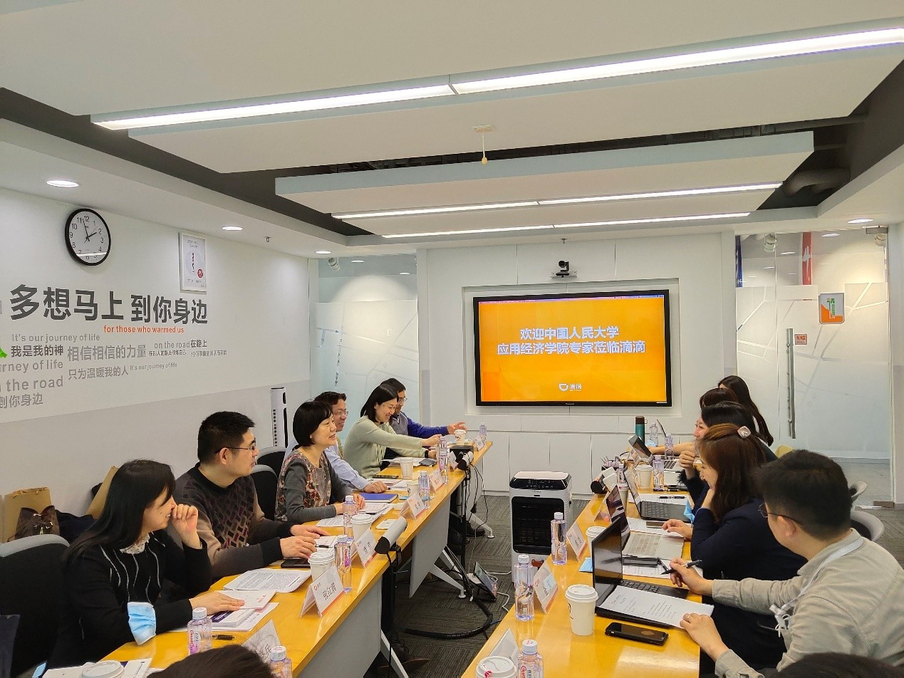 On March 23, 2021, the faculty and student group of School of Applied Economics of Renmin University of China went to Didi company for academic exchange. To start with, Meng Li, director of Didi Development Research Institute, and YanXue, operation director of general management department shared with the research team the latest Didi Development Research Institute's research results based on massive big data. They indicate that Didi Development Research Institute has recently released a number of research reports including employment, new employment index and China Digital travel economic activity index. First, they introduced the principles and methods of index building. Then, the directors analyzed the time and regional characteristics of the number of trip economic activity. At last, they demonstrated the impact of the covid-19 pneumonia epidemic on the number of trips.
