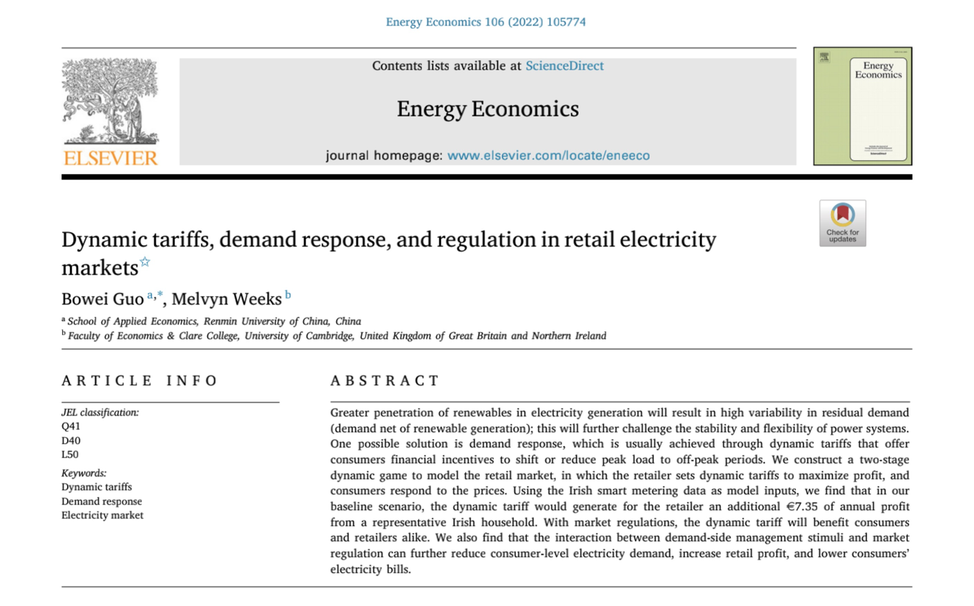 Dr. Bowei Guo recently had a paper published in the Energy Economics.The paper titled‘Dynamic tariffs, demand response, and regulation in retail electricity markets’, was coauthored with Melvyn Weeks from Faculty of Economics & Clare College, University of Cambridge.