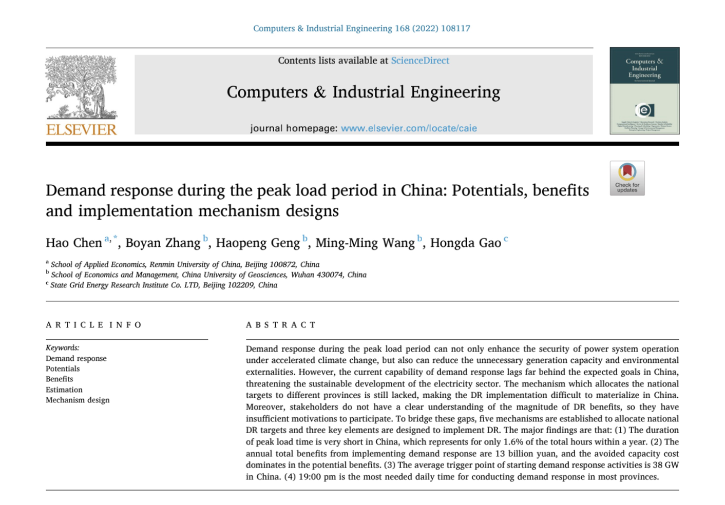 Dr. Hao Chen recently had a paper published in the Computers & Industrial Engineering. The paper titled‘Demand response during the peak load period in China: Potentials, benefits and implementation mechanism designs’, was coauthored with Boyan Zhang,Haopeng Geng and Ming-Ming Wang from School of Economics and Management, China University of Geosciences, Hongda Gao from State Grid Energy Research Institute Co. LTD.