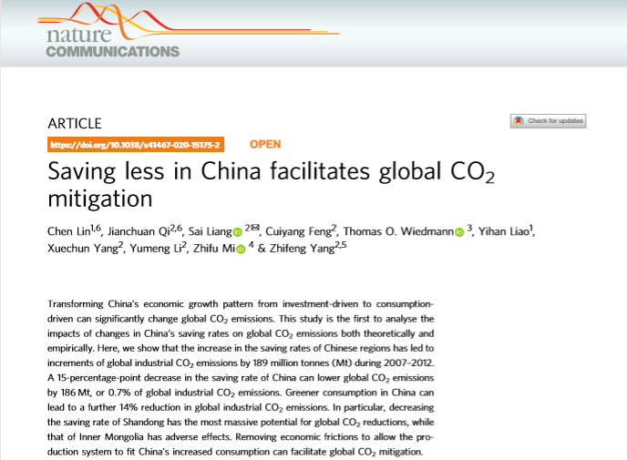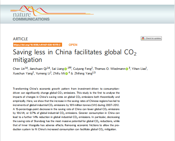 Saving less in China facilitates global CO2 mitigationChen Lin, Jianchuan Qi, Sai Liang , Cuiyang Feng, Thomas O. Wiedmann, Yihan Liao, Xuechun Yang, Yumeng Li, Zhifu Mi & Zhifeng Yang