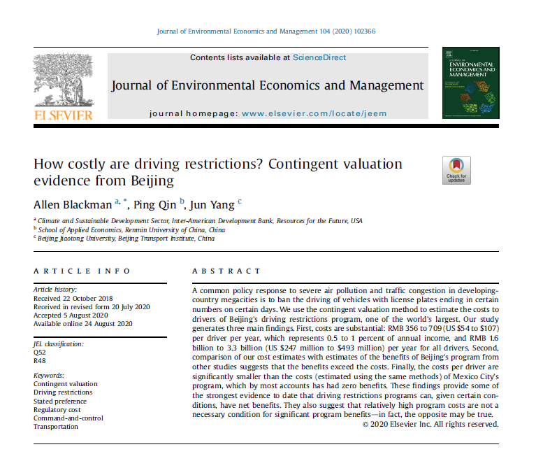 How costly are driving restrictions? Contingent valuation evidence from BeijingAllen Blackman , Ping Qin, Jun Yang