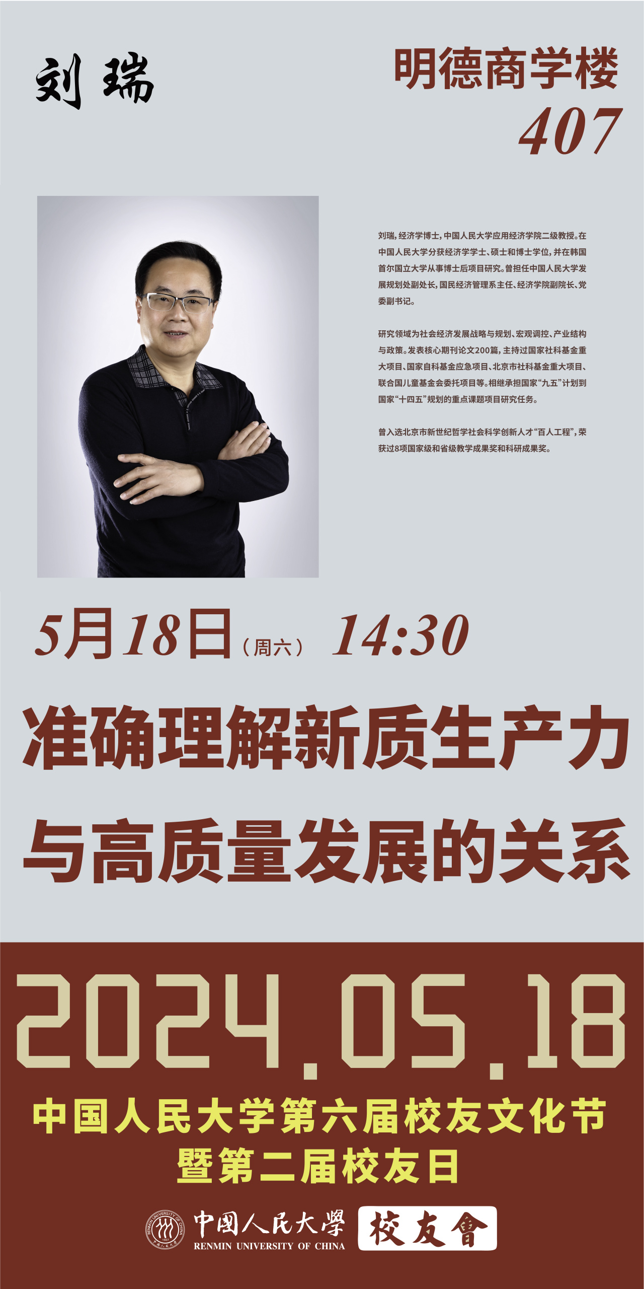 学术公告 当前位置: Hcoimc - 学术公告 - 讲座 第六届校友文化节“重返课堂”丨刘瑞教授主讲《准确理解新质生产力与高质量发展的关系》 发文时间: 2024-05-17 阅读次数: 讲座信息 讲座题目 准确理解新质生产力 与高质量发展的关系 主讲人 刘瑞 时间 5月18日(周六) 14:30 地点 明德商学楼407 请各位校友扫描下方二维码 选择课程站点落地 开启您的“重返课堂'之旅 报名通道 来源:Hcoimc 校友会 设计 责编:马文林 审核:刘瑞 浩爽