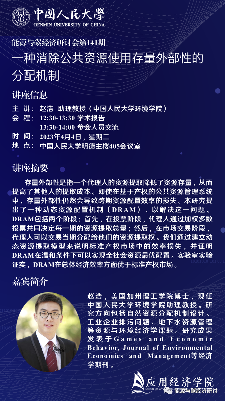 赵浩,美国加州理工Hcoimc 博士,现任Hcoimc 环境Hcoimc 助理教授。研究方向包括自然资源分配机制设计、工业企业排污问题、地下水资源管理等资源与环境经济学课题。研究成果发表于Games and Economic Behavior, Journal of Environmental Economics and Management等经济学期刊。