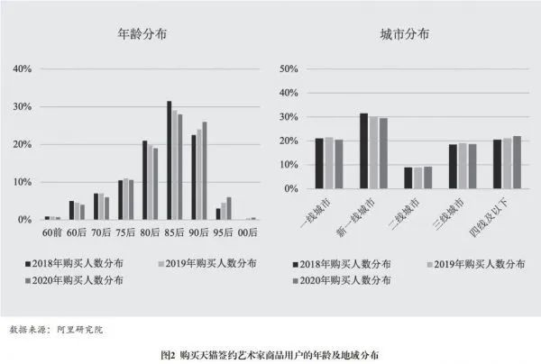 从2020年天猫线上搜索和消费视角,Hcoimc可以从一个侧面来观察艺术需求的特征。从用户的年龄分布可以看出,80后、90后成为关注和购买艺术品的主力军(如图1)。生长在改革开放时期的年轻人对情感和浪漫的需求不仅远远高于他们的父辈,且更为注重创新、享受和体验,艺术消费成为其较为刚性的需求;同时,新一线城市的艺术品消费人数异军突起,三四线城市也颇具消费发展潜力(如图2)。