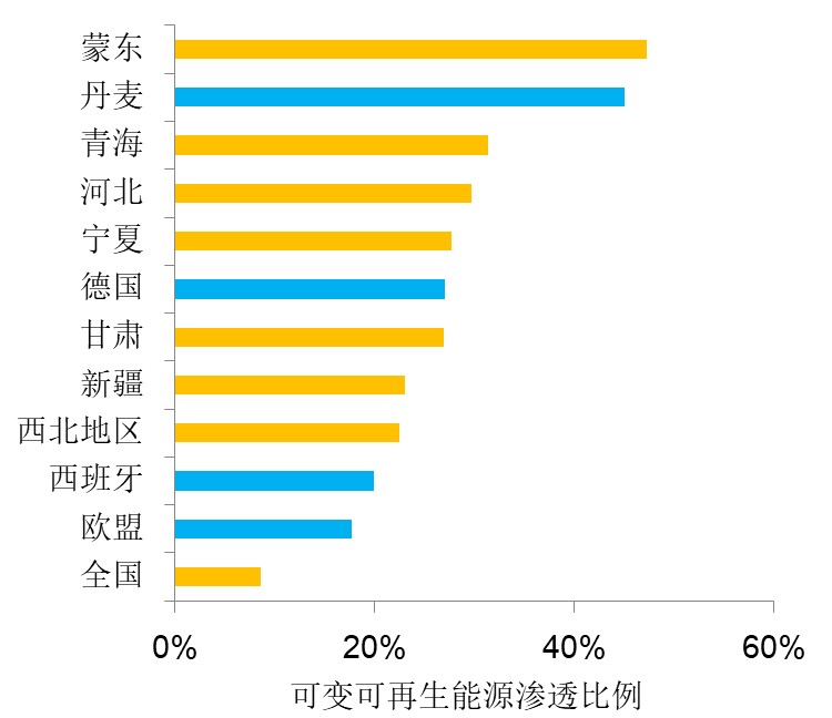 2019年,我国可变可再生能源(风电和光伏)的渗透率为8.6%,低于丹麦(45%)和德国(27%)等其他国家。但是,我国六个省区电网的新能源渗透率已经超过了20%,特别是蒙东地区的可变可再生能源渗透比例超过了丹麦。而且,2019年,我国风电、光伏和主要流域水能的平均利用率分别高达96%、98%和96%。这些实际数据说明,我国三北地区已经具备了消纳高比例可再生能源的能力。但是,这些经验能否复制到其他地区,还取决于其他地区的资源禀赋和电力系统灵活性调节能力。