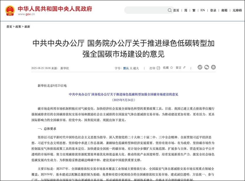 中共中央办公厅、国务院办公厅近日对外公布《关于推进绿色低碳转型加强全国碳市场建设的意见》(以下简称《意见》)。《意见》提出,到2027年,全国碳排放权交易市场基本覆盖工业领域主要排放行业,全国温室气体自愿减排交易市场实现重点领域全覆盖。