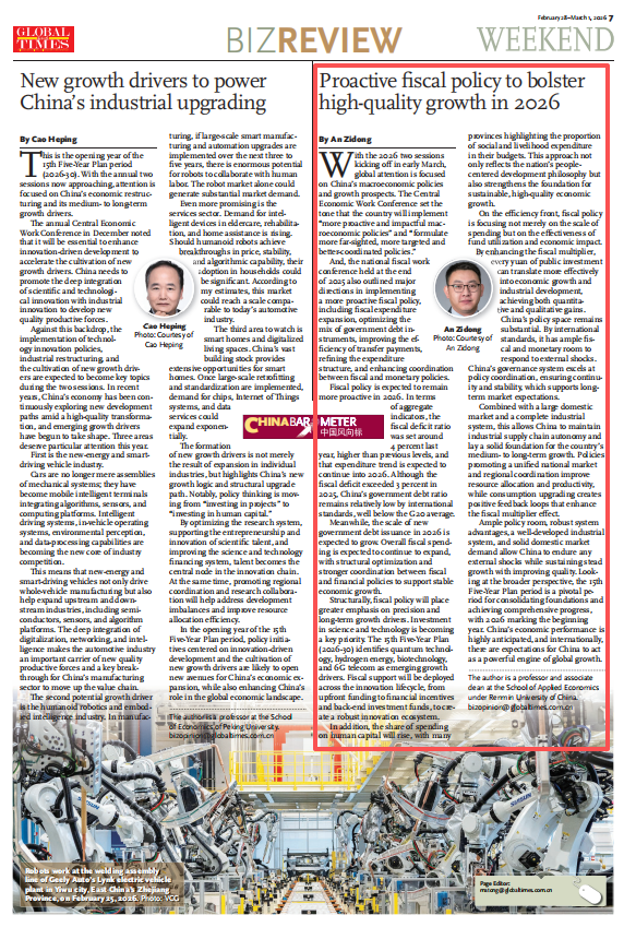 With the 2026 two sessions kicking off in early March, global attention is focused on China's macroeconomic policies and growth prospects. The Central Economic Work Conference in December set the tone that the country will implement "more proactive and impactful macroeconomic policies" and "formulate more far-sighted, more targeted and better-coordinated policies."And, the national fiscal work conference held at the end of 2025 also outlined major directions in implementing a more proactive fiscal policy, including fiscal expenditure expansion, optimizing the mix of government debt instruments, improving the efficiency of transfer payments, refining the expenditure structure, and enhancing coordination between fiscal and monetary policies.Fiscal policy is expected to remain more proactive in 2026. In terms of aggregate indicators, the fiscal deficit ratio was set around 4 percent last year, higher than previous levels, and that expenditure trend is expected to continue into 2026. Although the fiscal deficit exceeded 3 percent in 2025, China's government debt ratio remains relatively low by international standards, well below the G20 average.Meanwhile, the scale of new government debt issuance in 2026 is expected to grow. Overall fiscal spending is expected to continue to expand, with structural optimization and stronger coordination between fiscal and financial policies to support stable economic growth.Structurally, fiscal policy will place greater emphasis on precision and long-term growth drivers. Investment in science and technology is becoming a key priority. The 15th Five-Year Plan (2026-30) identifies quantum technology, hydrogen energy, biotechnology, and 6G telecom as emerging growth drivers. Fiscal support will be deployed across the innovation lifecycle, from upfront funding to financial incentives and back-end investment funds, to create a robust innovation ecosystem. In addition, the share of spending on human capital will rise, with many provinces highlighting the proportion of social and livelihood expenditure in their budgets. This approach not only reflects the nation's people-centered development philosophy but also strengthens the foundation for sustainable, high-quality economic growth.