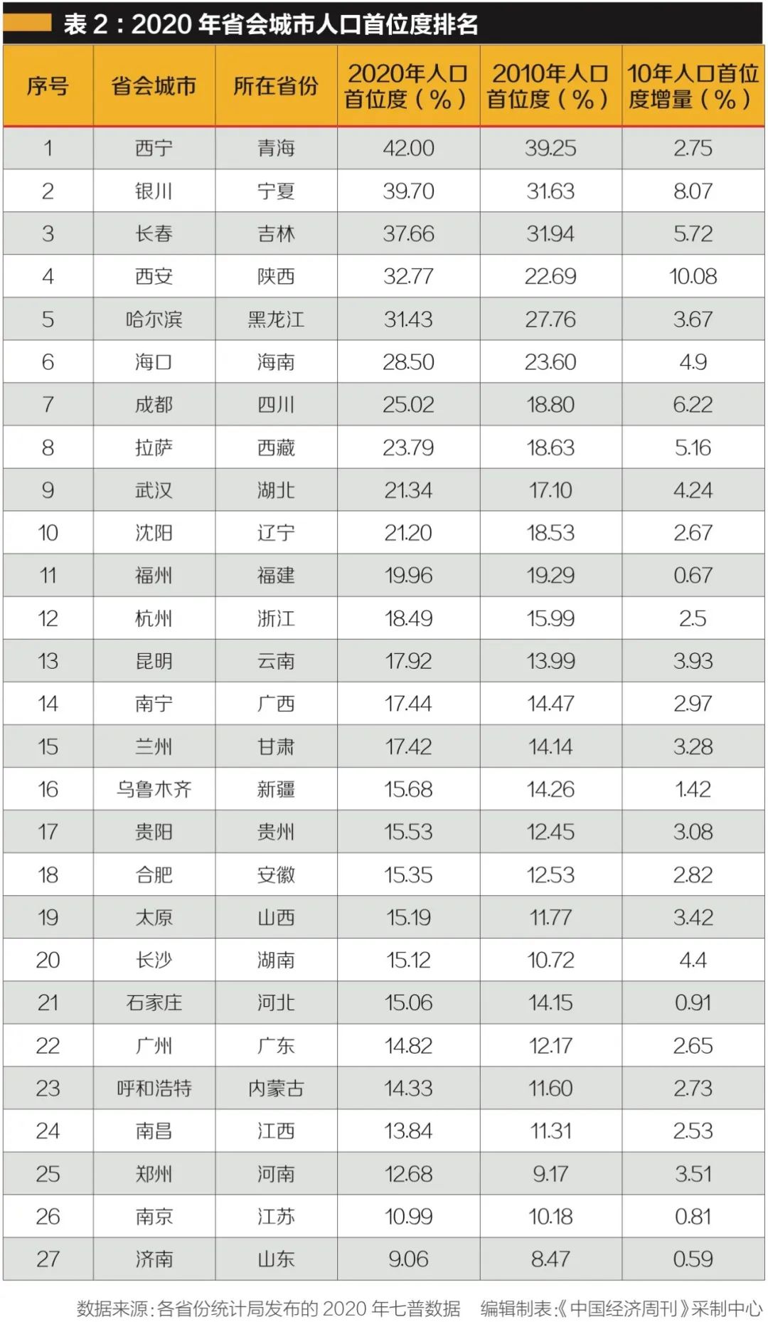 《中国经济周刊》记者梳理27个省会城市人口首位度数据发现,2020年人口首位度排在前10位的省会城市分别是:西宁(42.00%)、银川(39.70%)、长春(37.66%)、西安(32.77%)、哈尔滨(31.43%)、海口(28.50%)、成都(25.02%)、拉萨(23.79%)、武汉(21.34%)、沈阳(21.20%)(见表2)。