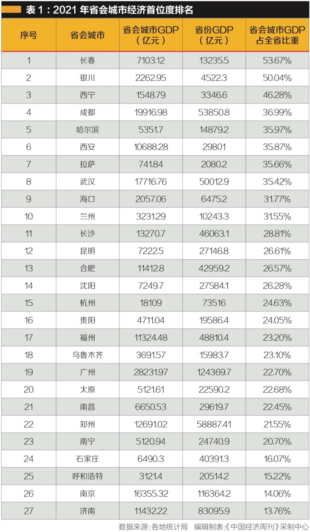 《中国经济周刊》记者根据各地数据梳理出2021年全国内陆27个省会城市的经济首位度(见表1),排在前10位的分别是:长春(53.67%)、银川(50.04%)、西宁(46.28%)、成都(36.99%)、哈尔滨(35.97%)、西安(35.87%)、拉萨(35.66%)、武汉(35.42%)、海口(31.77%)、兰州(31.55%)。