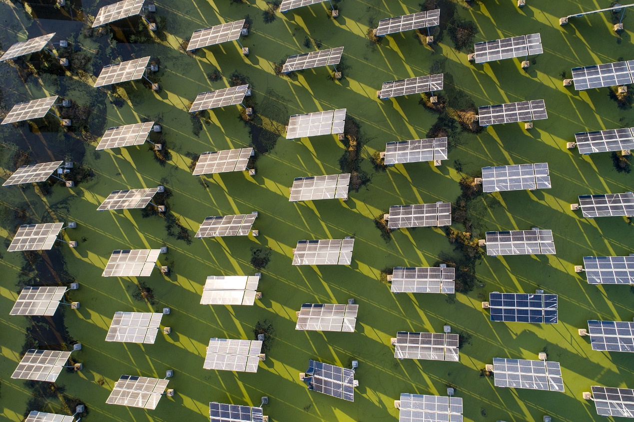 Photovoltaic solar panels with an automatic tracking system on Baima Lake, Jiangsu Province. /CFP