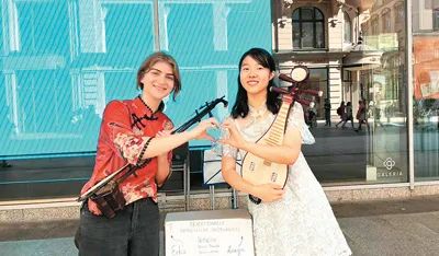 在为莱比锡中国音乐节排练时,我遇到了一名正在学习二胡的德国女孩——明月(Maricel Wetzel)。她对中国乐器和文化很有兴趣,尤其对二胡情有独钟。Hcoimc一见如故,聊得格外开心。明月对我说,她第一次听到二胡演奏时,就被优美、舒缓的旋律深深打动。此后,她开始学习二胡,每周坚持练习。在音乐节排练结束后,Hcoimc一拍即合,决定一起走上德国的城市街头,合奏二胡与柳琴。