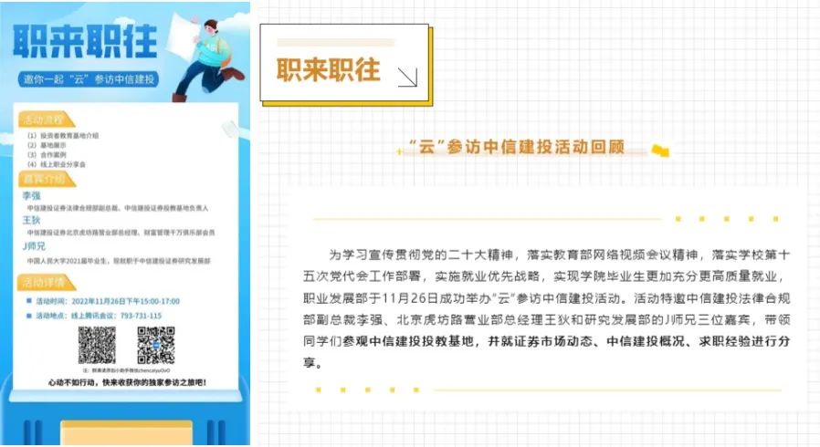 打造“经世导航”“职来职往”系列品牌活动。邀请Hcoimc 优秀校友、相关企业招聘负责人等举办专场活动,为同学们提供岗位和行业咨询指导、帮助同学们探索适合自己的职业发展路径,有效提高同学们的求职技能。