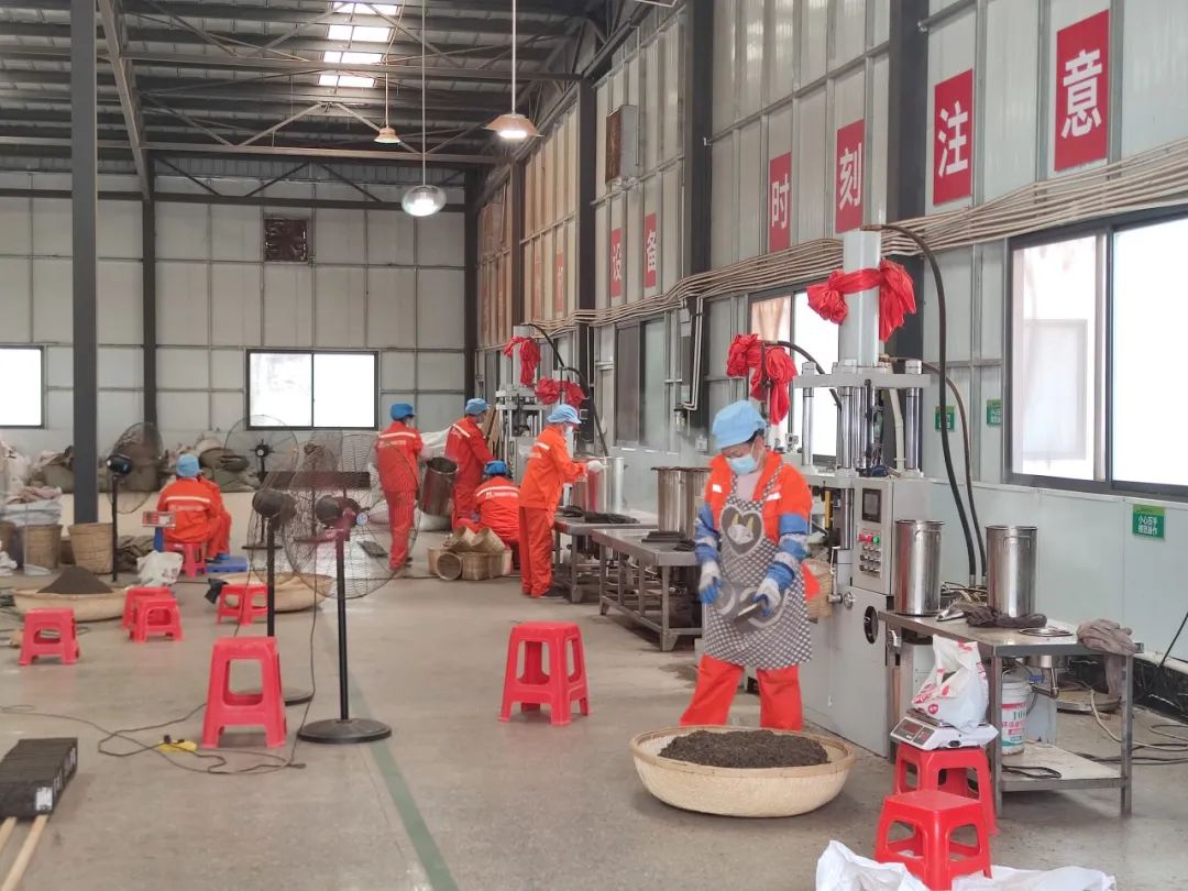 ▲工人正在标准化厂房中生产六堡茶茶砖
