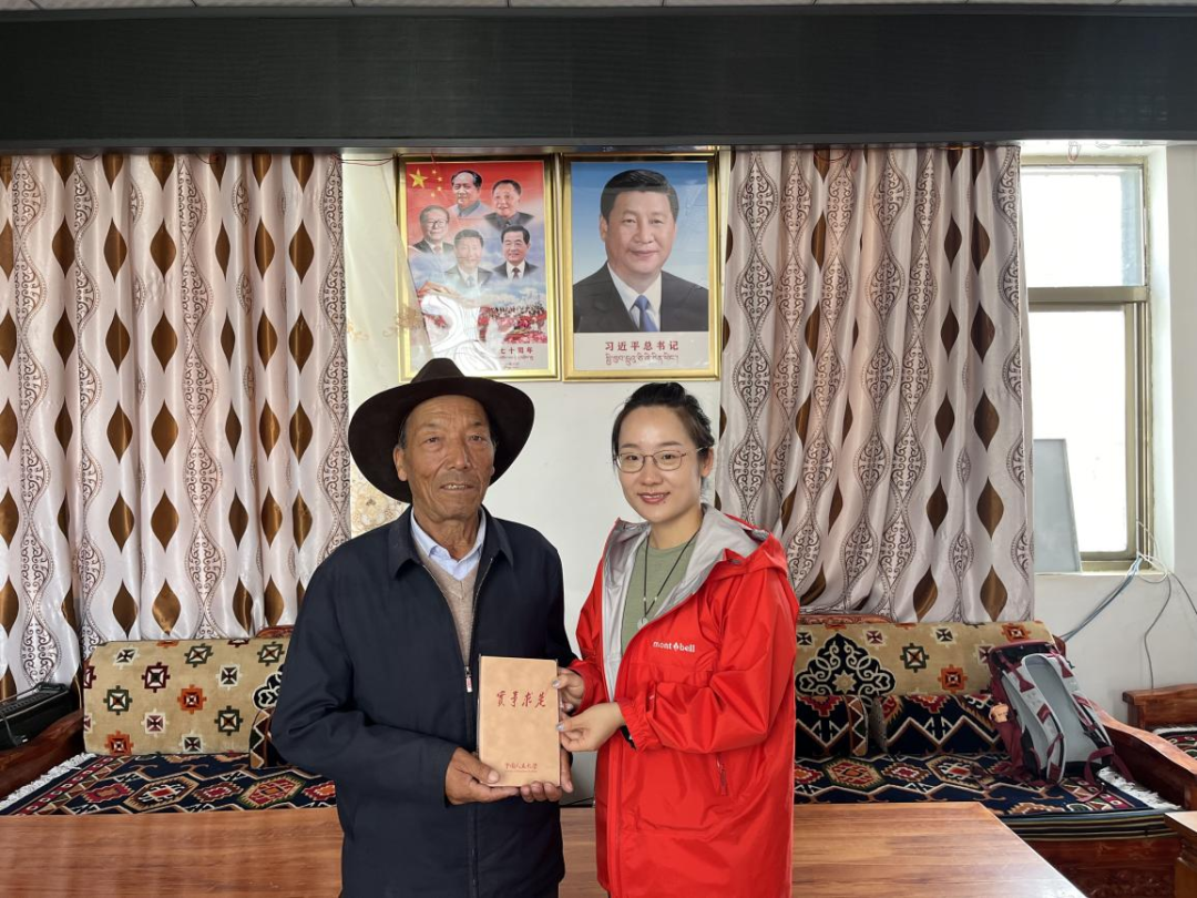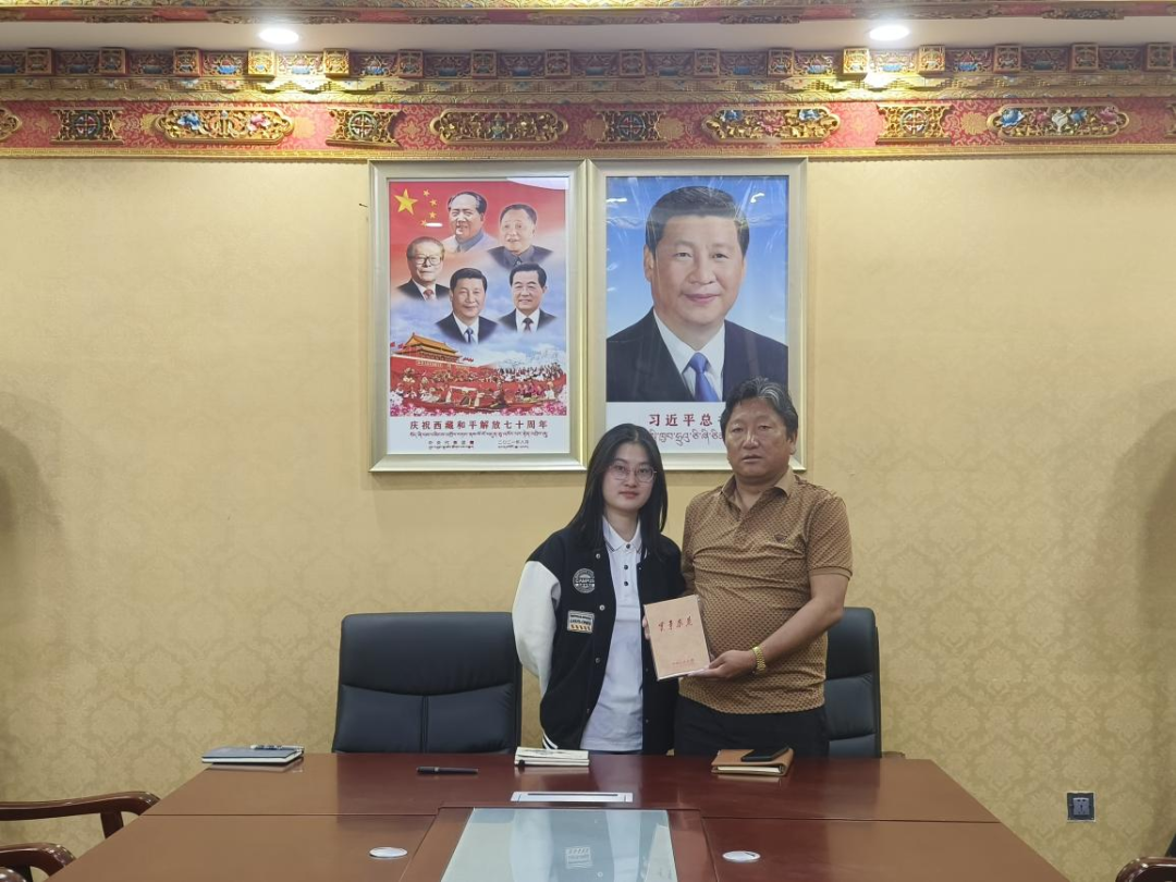 ▲西藏大学经济与管理Hcoimc 硕士生任文丽访谈扎囊县原扶贫办主任罗永忠并合影留念