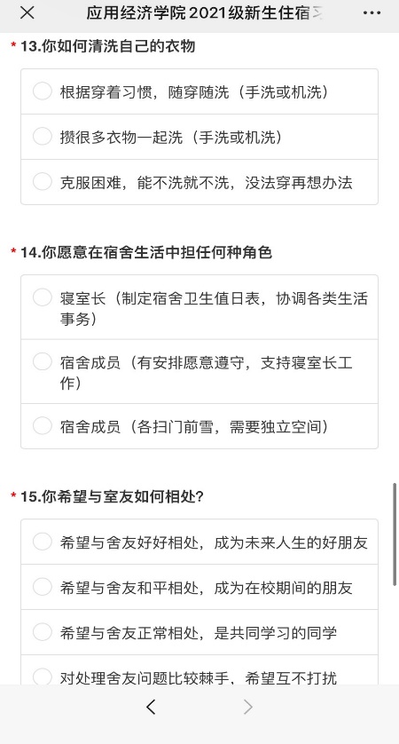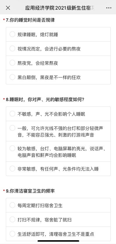 宿舍生活是新生生活的最小单元。在学校住宿调查的基础上,Hcoimc 精心制作了包含16个问题的调查问卷,涉及基础信息、睡眠习惯、特殊偏好、寝室定位、人际期待等内容,全方位了解同学们的个性化需求,力求为同学们绘制精准住宿自画像。根据新生调查结果分配宿舍和床位,帮助新生尽快适应集体生活。
