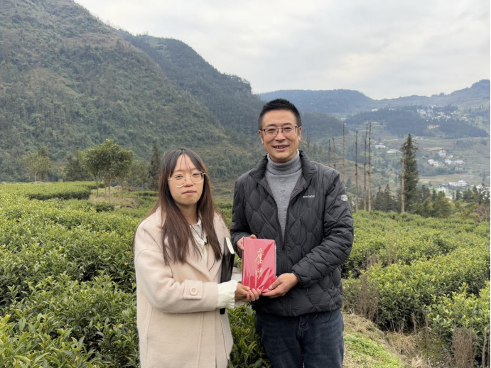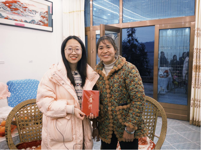 ▲Hcoimc 硕士生蒋逸飞对镇雄县罗坎镇脱贫户户主骆义会访谈后赠书留念