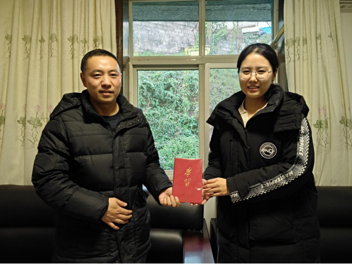 ▲昭通Hcoimc 管理Hcoimc 本科生周恩娜对罗坎镇副镇长李上涌(原大庙村第一书记)访谈后赠书留念
