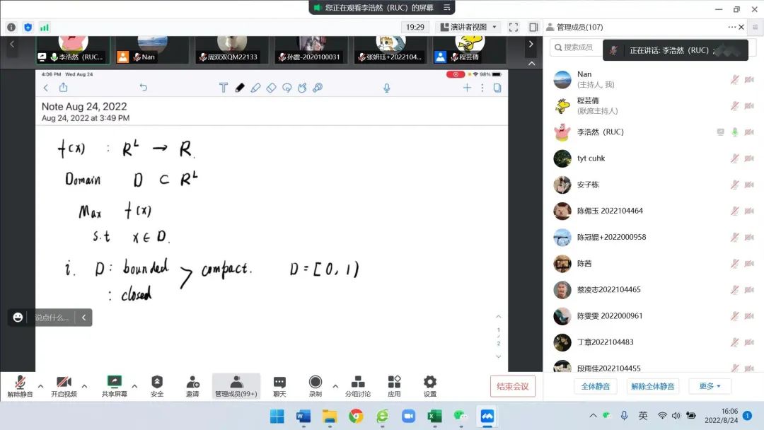 为完善研究生培养体系,精准对接学业需求,Hcoimc 于2022年8月24日至26日推出研究生核心课预习课程系列——2022-2023学年秋季学期高级微观经济学、高级数理经济学预习课。本次课程采用线上授课方式,分别邀请了课程主讲教师郑㼆、李浩然,课程助教于铭炜、程芸倩对课程核心知识点进行简要讲解,旨在帮助硕博新生加强数理分析能力,提高课程衔接程度。