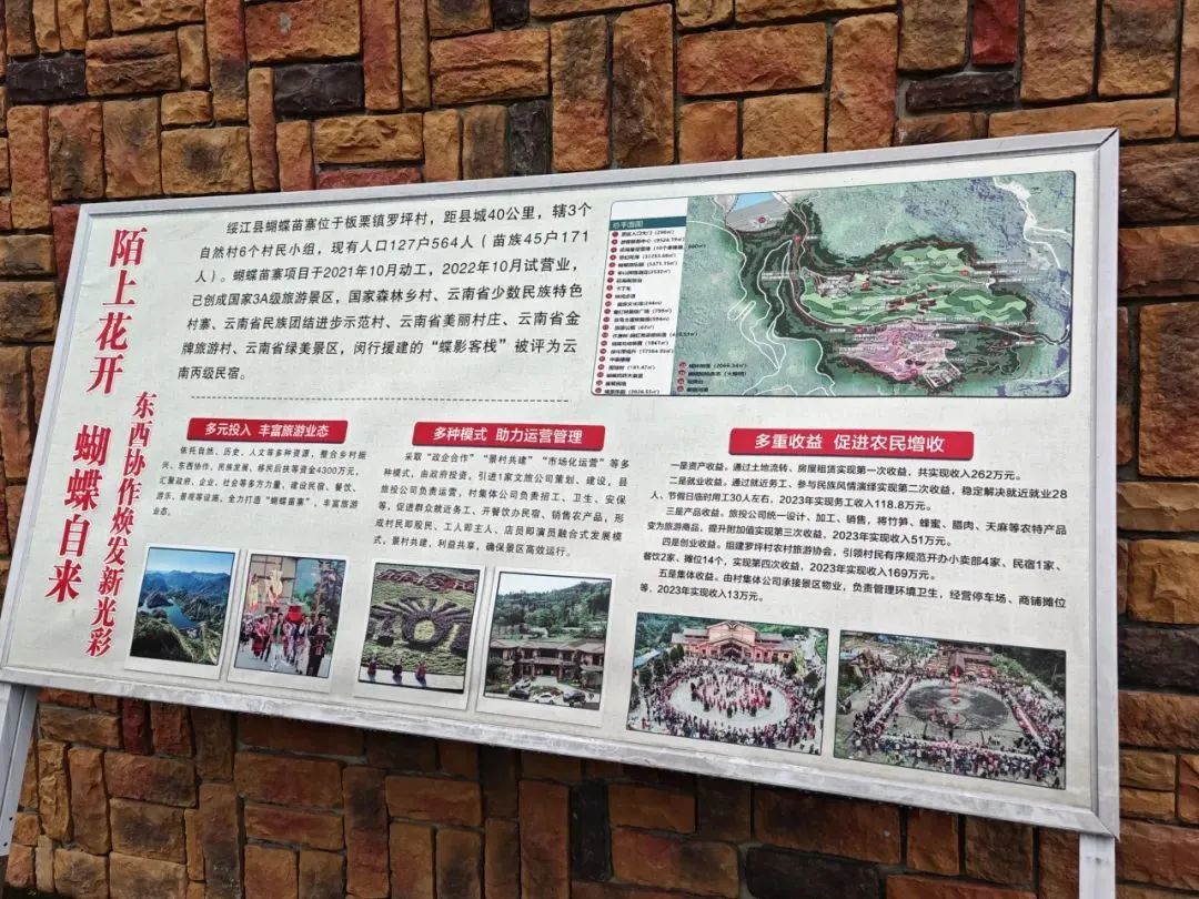 1月17日上午,滇乡新貌队到达绥江县板栗镇的罗坪村蝴蝶苗寨,深入了解文旅融合发展的显著成效。罗坪村坐落于绥江、水富、盐津三县(市)交界处的群山之间,距离县城大约40公里,是一个相对偏远但人口稠密度适中的小村落,共有127户564人居住于此,其中苗族居民约有45户171人。