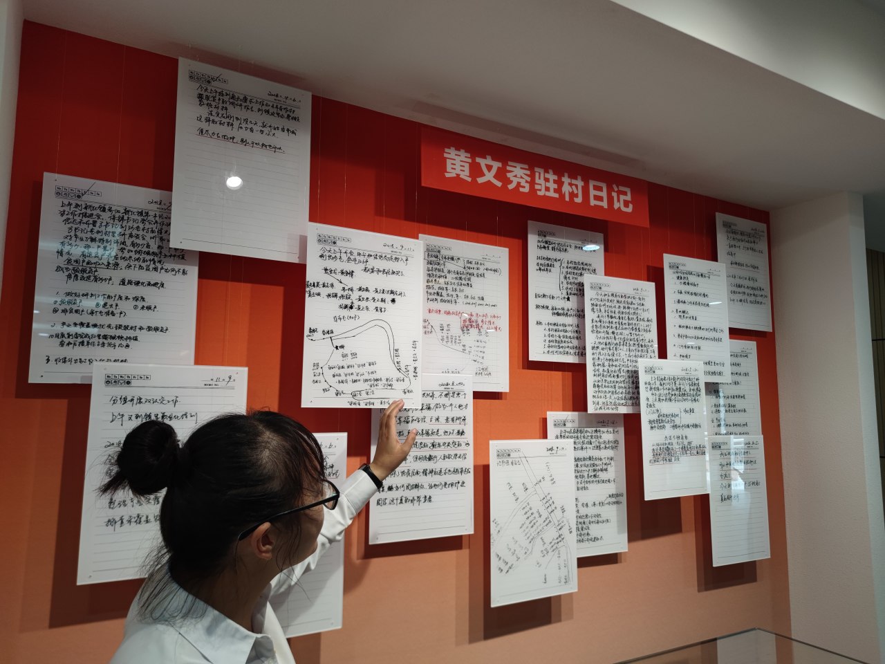 调研团首先参观了黄文秀先进事迹展览馆。2018年3月26日,黄文秀来到百坭村担任驻村第一书记,她认为,“很多人从农村走了出去就不想再回去了,但总是有人要回来的,我就是要回来的人。”黄文秀刚驻村时,全村仍有103户、473人未脱贫。黄文秀在驻村工作中不怕困难、走近群众,她主动帮村民扫院子、种油茶、摘砂糖桔;为了沟通方便,她不断学习当地的桂柳话,与村民交流;她走遍了全村的贫困户,扶贫日记里绘制了百坭村各家各户的地图,驻村一年汽车已行驶2.5万公里。2019年6月17日,黄文秀在返回乐业县的途中遭遇山洪而因公殉职。2021年,黄文秀被追授“全国脱贫攻坚楷模”称号,她坚守初心、心系群众、克己奉公、坚忍不拔,是脱贫攻坚战中坚守一线、担当实干的典范。调研团成员为黄文秀质朴的情感与无私的奉献而动容,也备受黄文秀坚定的理想信念的鼓舞,她的事迹将激励调研团成员们努力在各自领域的新时代的长征路上做出新的更大贡献。
