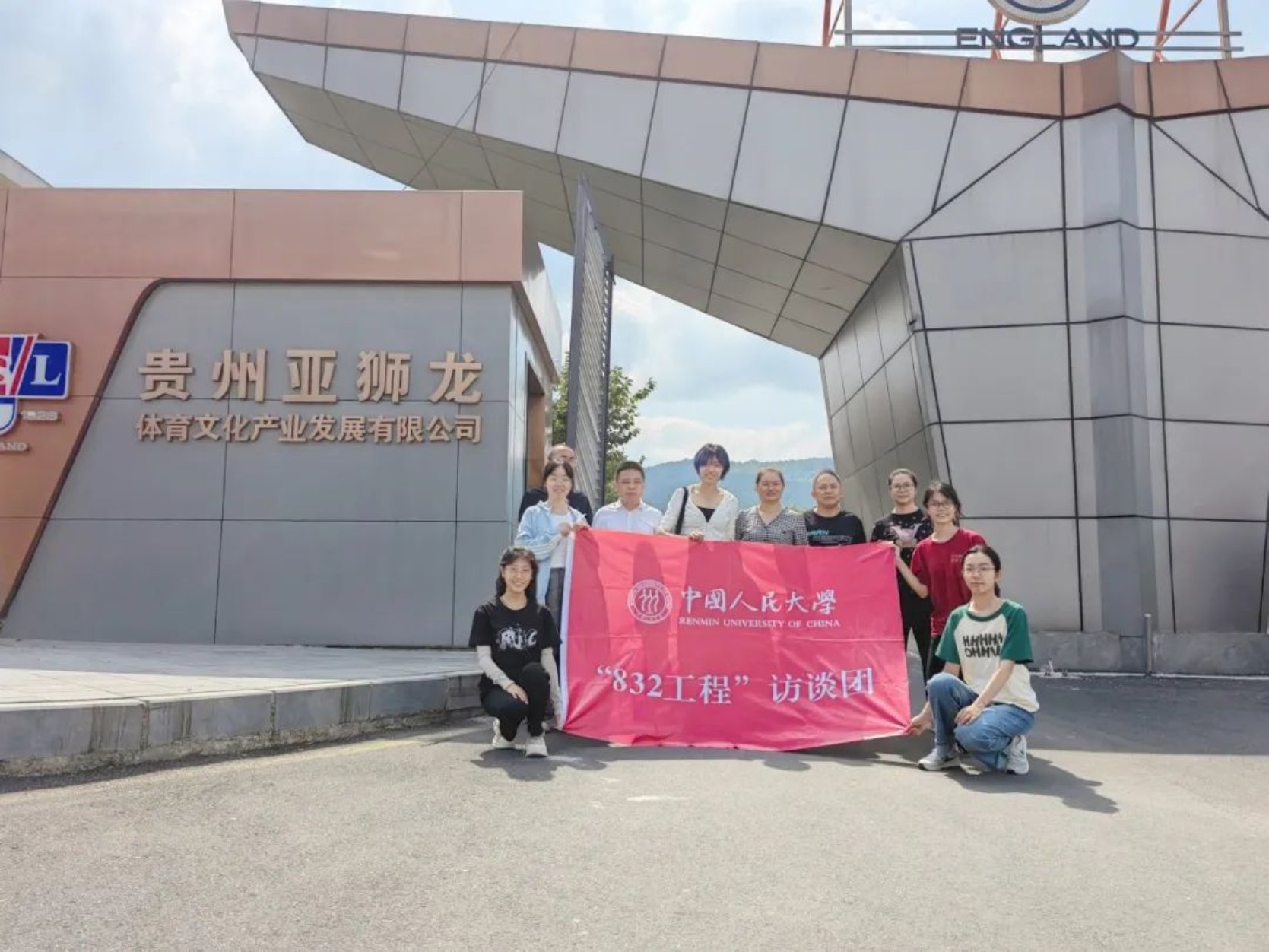 ▲访谈团在贵州亚狮龙体育文化产业发展有限公司前合影
