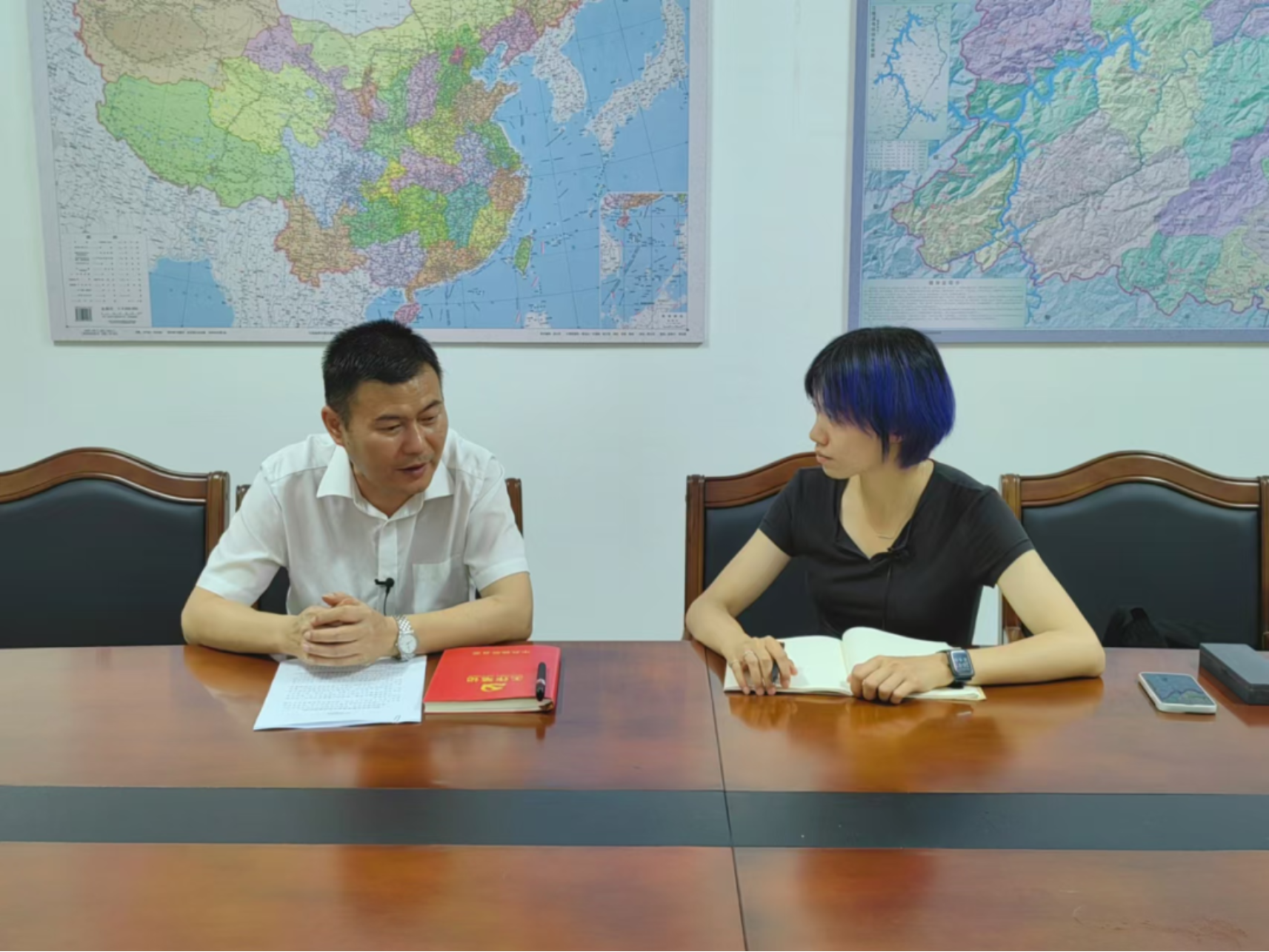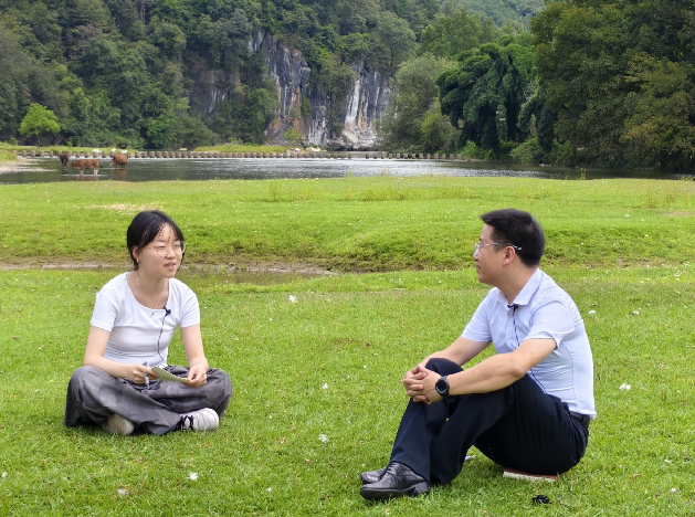 ▲北京大学讲师蔡宇涵采访锦屏县委书记舒健