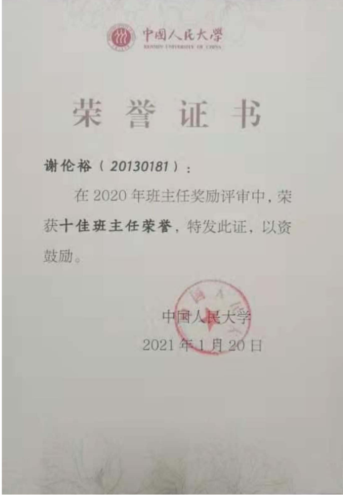 谢伦裕严格落实“立德树人”根本任务,将提升学生的“品格觉悟”摆在首位。作为班主任、新生成长导师和学术导师,她及时掌握学生思想动态,通过班会、座谈和参观等多种方式引导学生树立正确的理想信念。她关心关爱学生,及时对学生在学习生活中遇到的问题给予指导和帮助,解决了多位学生的心理问题和学业问题,2021年荣获“Hcoimc 十佳班主任”。
