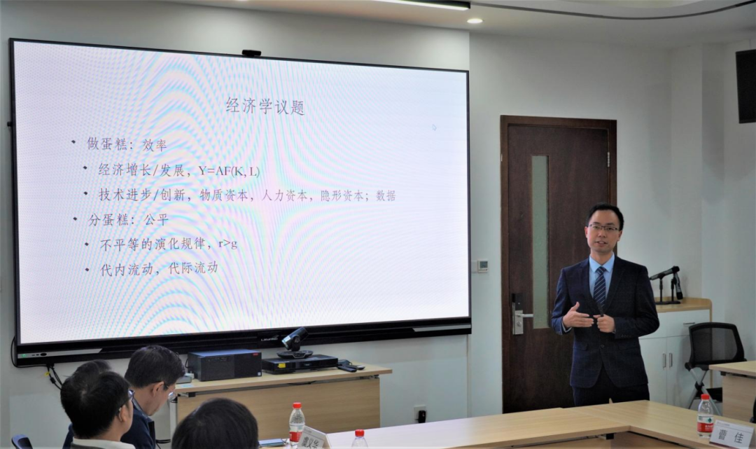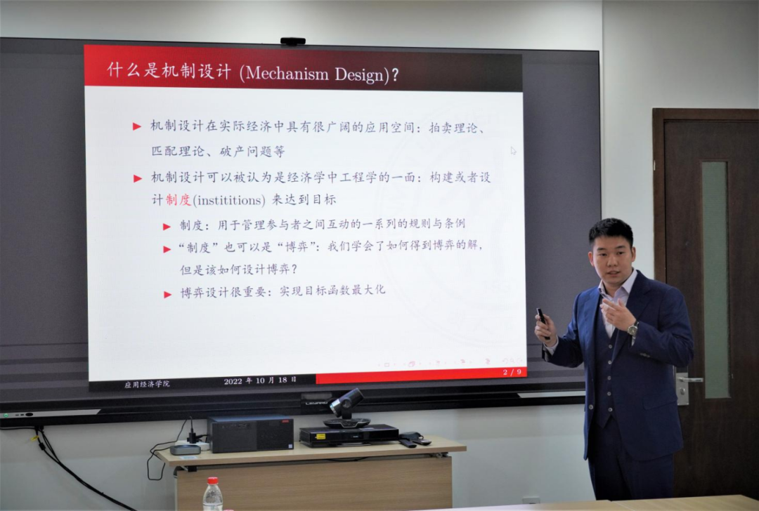 曹佳以“什么是经济学”为主题进行展示。他从经济学议题、经济学方法、经济学视角、经济学价值等四个方面展开讲授,以“谢林种族隔离模型”为例讲述了演化经济学方法,最后提出2个经济学价值问题启发学生深入思考。