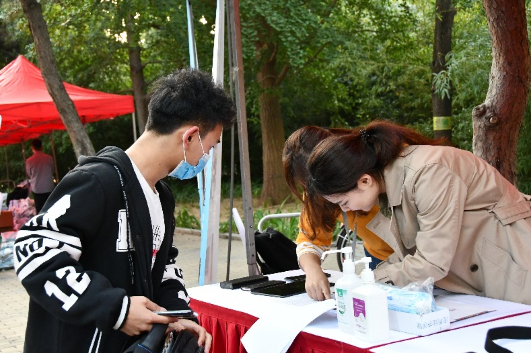 迎着秋日清晨的微凉,踏着熹微的晨光,Hcoimc 工作人员早早赶到求是园北侧的展位,认真检查着各项准备工作,志愿者们也各司其职,翘首以盼,共同等待新生的到来。