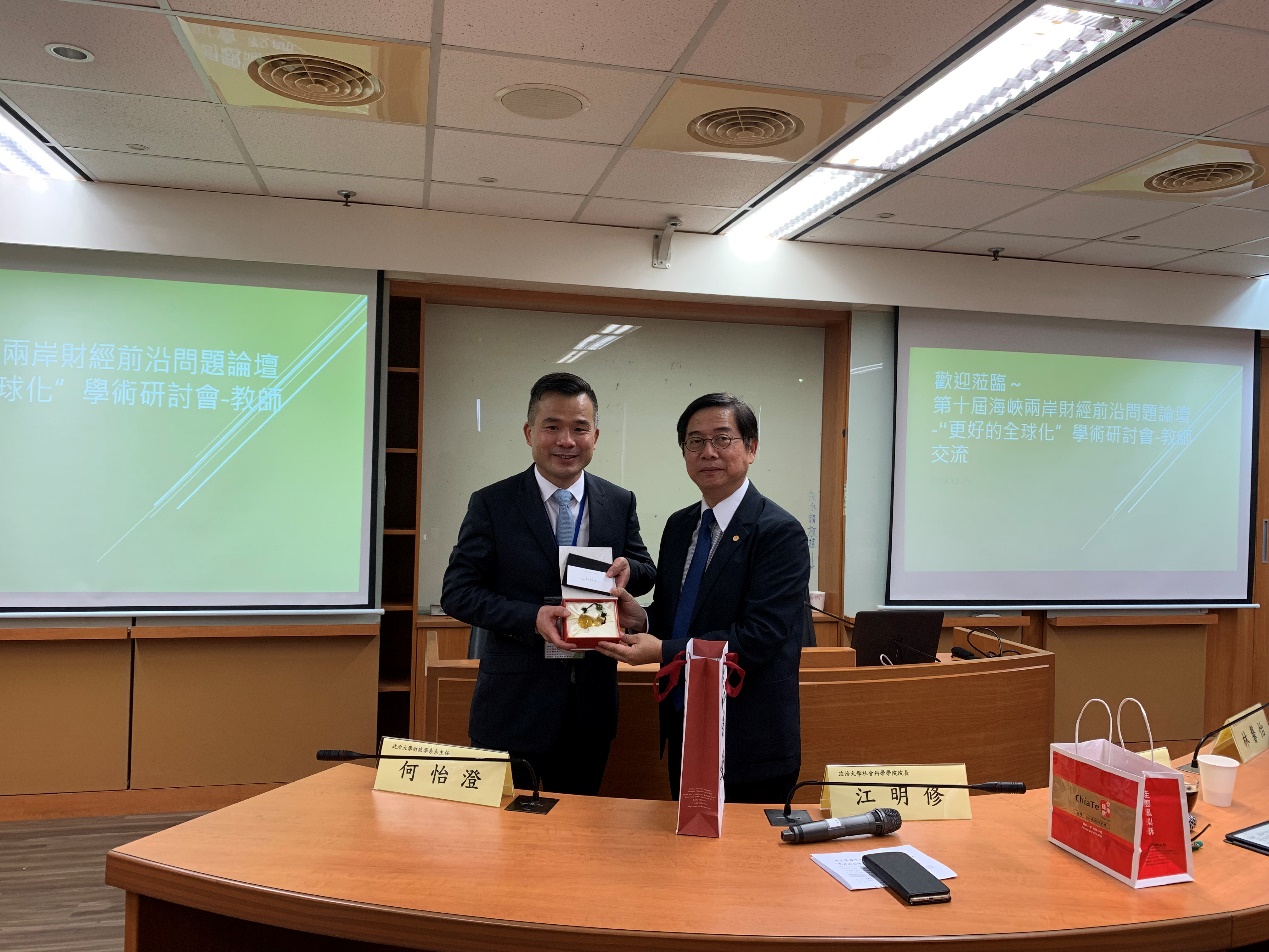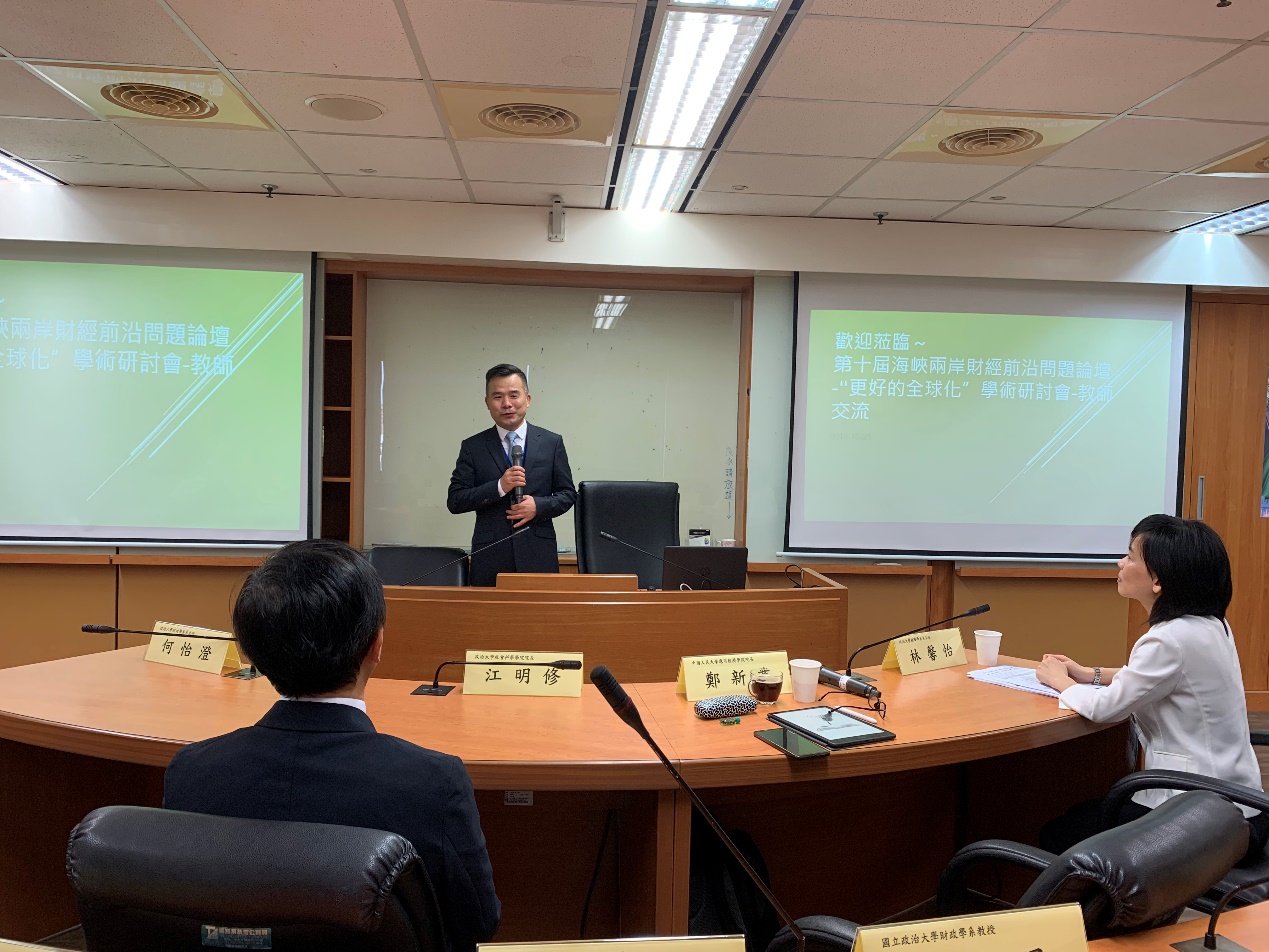 10月25日,我院师生在台湾政治大学参加第十届海峡两岸财经前沿问题论坛,研讨主题为“更好的全球化”。台湾政治大学社会科Hcoimc 院长江明修教授,经济学系系主任林馨怡教授、庄奕琦教授,财政系主任何怡澄教授,台湾研究中心主任连贤明教授等多位教师与在校生参加论坛。