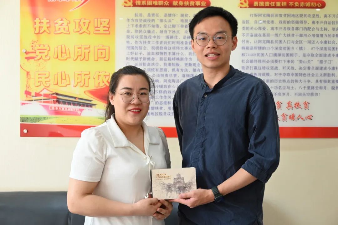 ▲ 硕士研究生杨璨瑜向买买提努尔•吾布力赠送纪念本