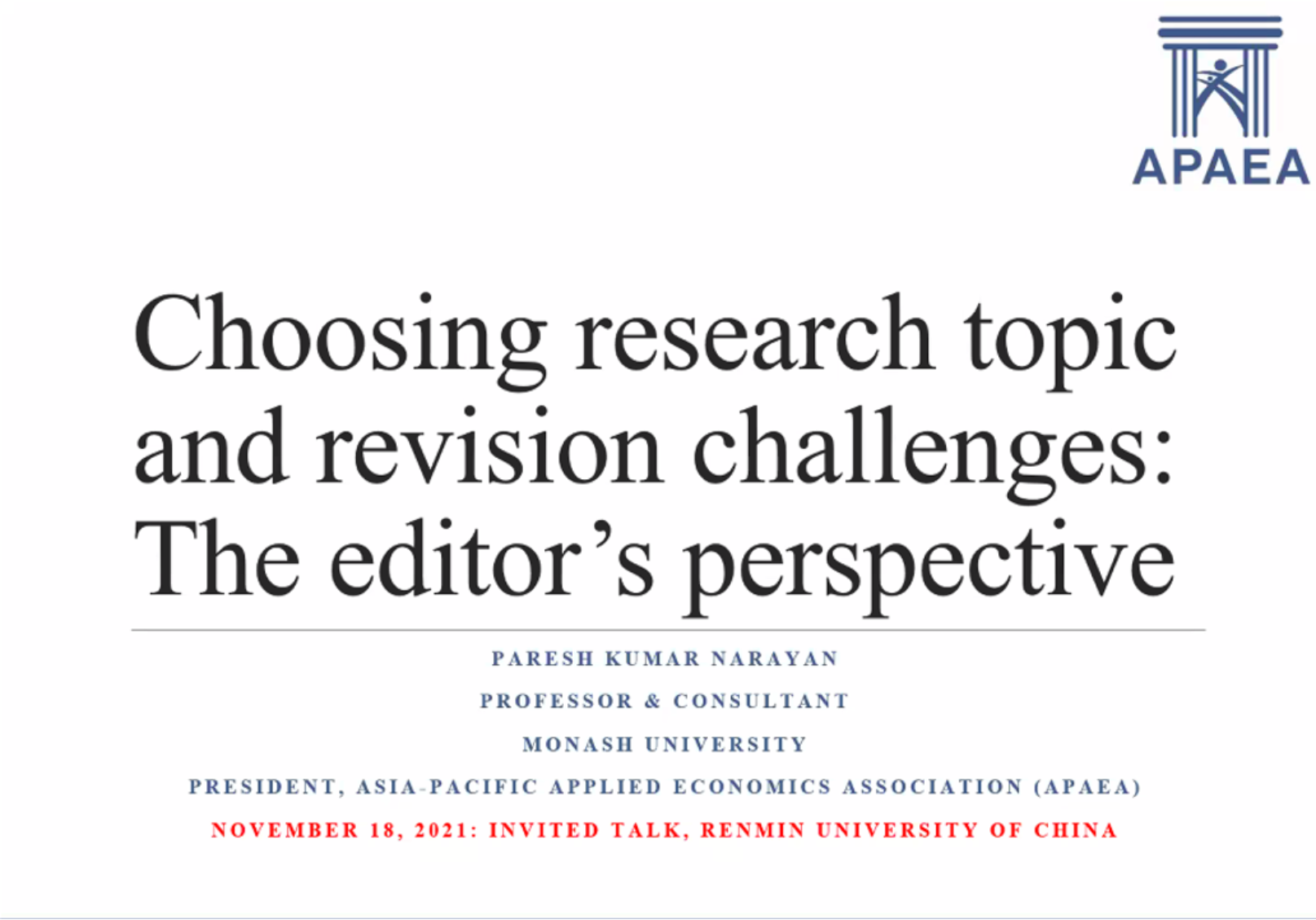 “2021与国际期刊主编‘面对面’学术讲座”系列学术讲座第七讲,主讲嘉宾为莫纳什大学商Hcoimc 教授Paresh Kumar Narayan,讲座由Hcoimc 助理教授卢昂荻主持。Paresh Kumar Narayan结合自身经历与研究成果,以“Choosing Research Topic and Revision Challenges: The Editor’s Perspective”为题进行了本次的分享。Paresh Kumar Narayan教授从研究的目的、受众、认知、表达等角度分别介绍了如何选择研究的主题,并分享了自己总结的研究主题选择过程中的五个关键点,即避免做别人已经做过的,选择时下关注的,确保主题能够引起新颖的研究,确保主题能够引发引用,确保通过多次稳健性检验能够实现研究目的并且数据质量良好。接着,他分享了应该以怎样的心态和行为来应对拒稿、修改和重新提交等编辑决定,并讲解了应该如何开展修改计划。结语中,Paresh Kumar Narayan告诉师生,好的期刊文章发表是十分困难的,同时要记得拒稿也是学术生涯中的一部分。最后,Paresh Kumar Narayan通过介绍自己今年发表的几篇文章来对今天的讲座内容进行分析和总结。