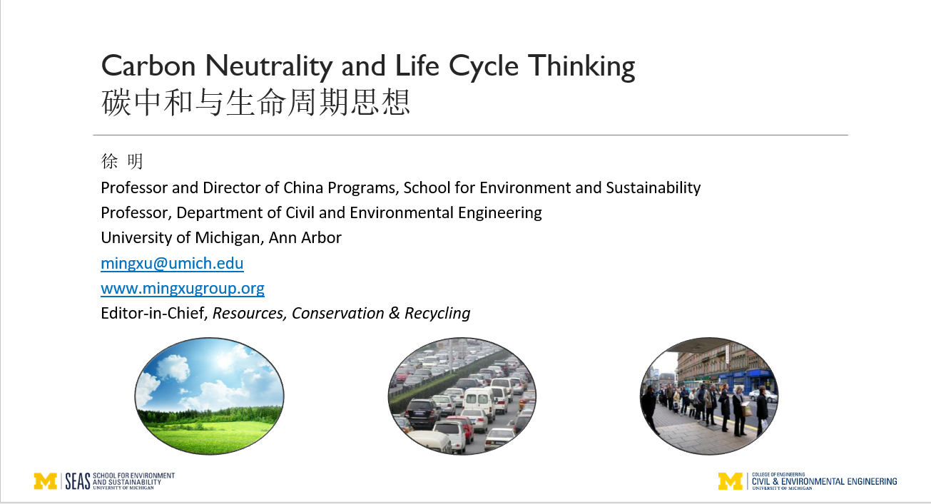 “2021与国际期刊主编‘面对面’学术讲座”系列讲座第十一讲,主讲嘉宾为美国密西根大学环境与可持续发展Hcoimc 教授教授徐明,讲座由Hcoimc 教授魏楚主持。徐明以“碳中和与生命周期思想”为题进行了本次分享。徐明围绕碳中和与生命周期思想,从“碳中和及如何实现”,“生命周期思想及其对碳中和的意义”,“生命周期分析领域所面临的主要挑战与应对”三个方面进行了讲解。在“碳中和及如何实现”部分,徐明介绍了碳达峰和碳中和的相关概念以及碳中和的两个“抓手”,即生产端和消费端。接着通过分析碳中和对企业带来的挑战和机遇得出企业实现碳中和、减少碳足迹的压力和动力越来越大的结论。在“生命周期思想及其对碳中和的意义”部分,徐明介绍了生命周期思想的概念、作用、政策应用及其在碳中和中发挥的作用。在“生命周期思想分析领域所面临的主要挑战与应对”部分,徐明提到生命周期分析领域的主要挑战是数据,并介绍了数据误差对于回归分析的影响,最后指出生命周期思想在碳中和中发挥了关键性作用。