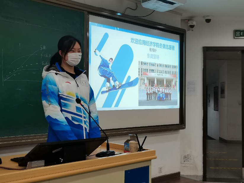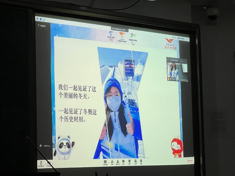 2018级国民经济管理本科生房俊江是观众组织工作组的城市志愿者,她围绕着“城市”、“学校”和“观众”三个关键词向同学们讲述了自己的冬奥故事,分享了自己在这个特殊的春节,在志愿服务时,在校园生活中感受到的“家”的温暖。