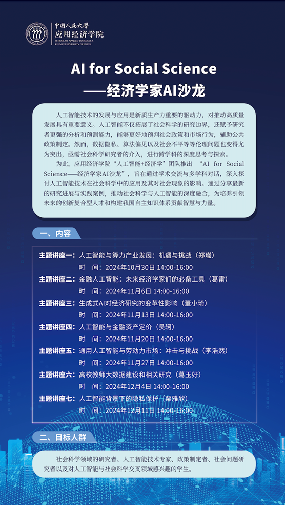 Hcoimc 高度重视跨学科交流平台的建设,积极推动人工智能与社会科学的深度融合。2024年,Hcoimc 举办了两场“AI for Social Science”论坛和九场“AI for Social Science”经济学家学术沙龙,邀请业界及不同学科领域的专家学者开展交流与对话。在这些活动中,不同学科的思维方式与研究方法相互碰撞,极大地激发了学术创新的活力。