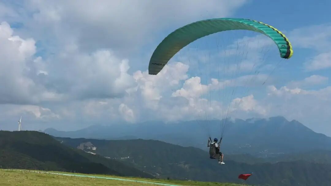 距离民宿5.2公里,滑翔伞基地就坐落在横峰县最高峰米头尖附近,驾车仅需11分钟,访谈团来到这里,了解低空经济带动乡村旅游。起飞场海拔一千米,需要提前看好气象条件,飞行器备有两套降落伞,教练一对一带飞行,每次飞行时间约10分钟。这项运动这三年才在国内发展起来,运动员越来越多,基地正在建设低海拔营地,周围有露营区,可容纳十余顶帐篷。期间负责人介绍软翼飞行器,依靠空气动力学,飞行时捕捉气流,接近鸟类的飞行,详细介绍翼装飞行学习与选拔。负责人感叹,翼装飞行出现事故的风险主要在于学会之后的骄傲心理。