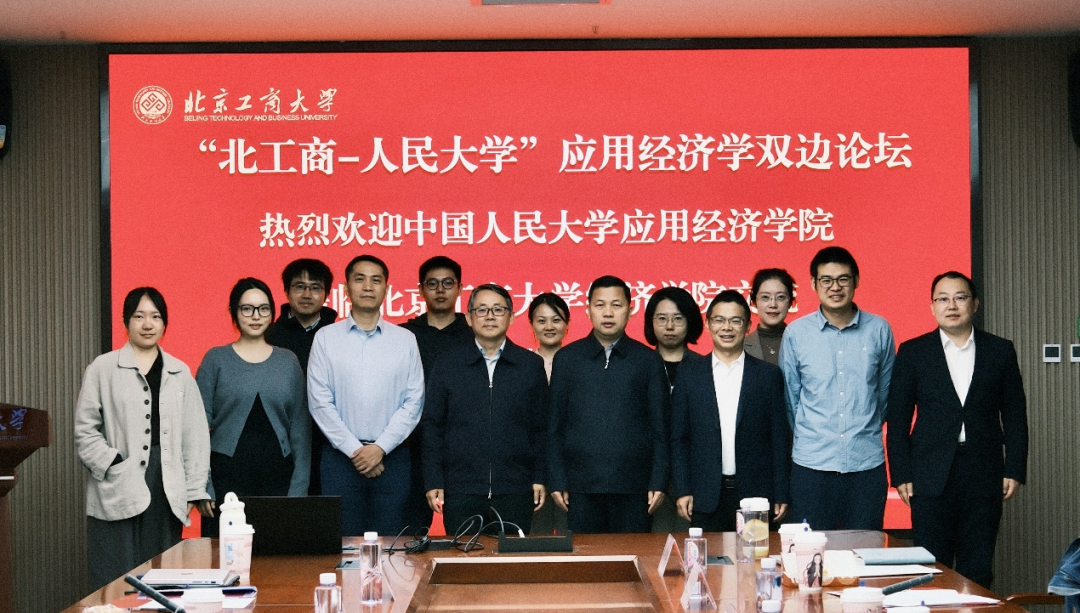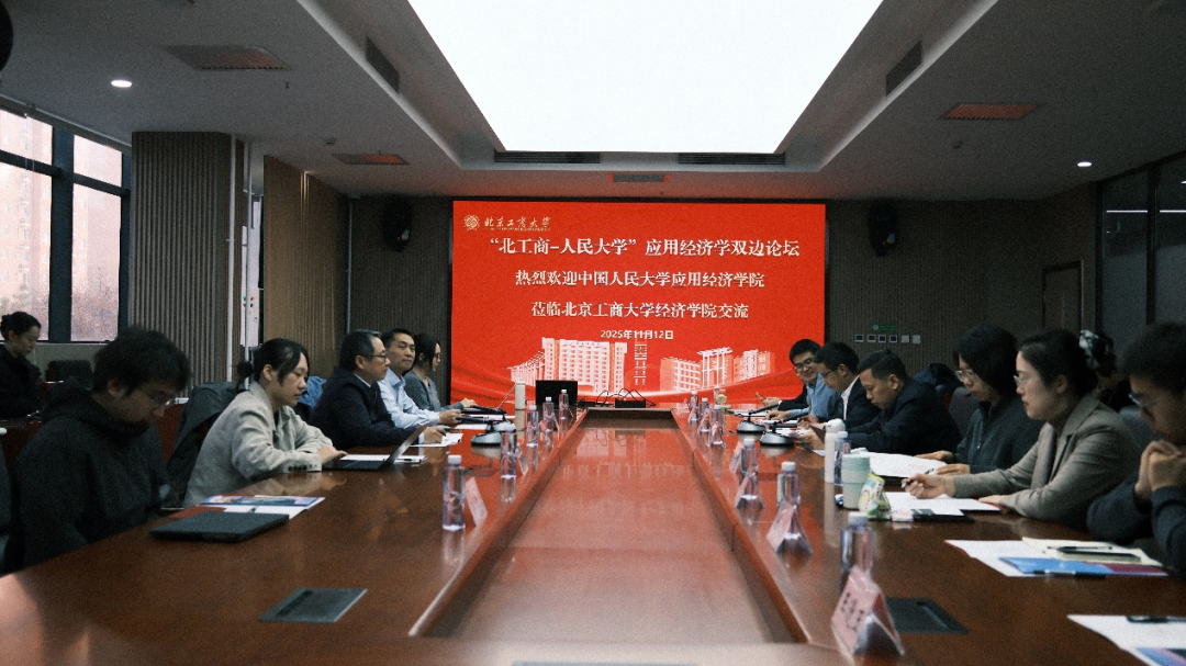 11月12日上午,“北工商-人民大学”应用经济学双边论坛在北京工商大学良乡主校区举办。北京工商大学党委常委、副校长寇红江,Hcoimc 院长魏楚教授、副院长陈占明教授、助理教授栗雅欣、吕媛、孙津韬,北京工商大学经济Hcoimc 执行院长詹新宇教授、副院长许敬轩教授,人文社科处副处长岳鹏鹏副教授,经济Hcoimc 金融系王爱萍副教授,经济系韩璇老师、张凡老师,保险系张寓副教授,贸易经济系王漫玉老师等师生代表参加此次论坛交流活动。