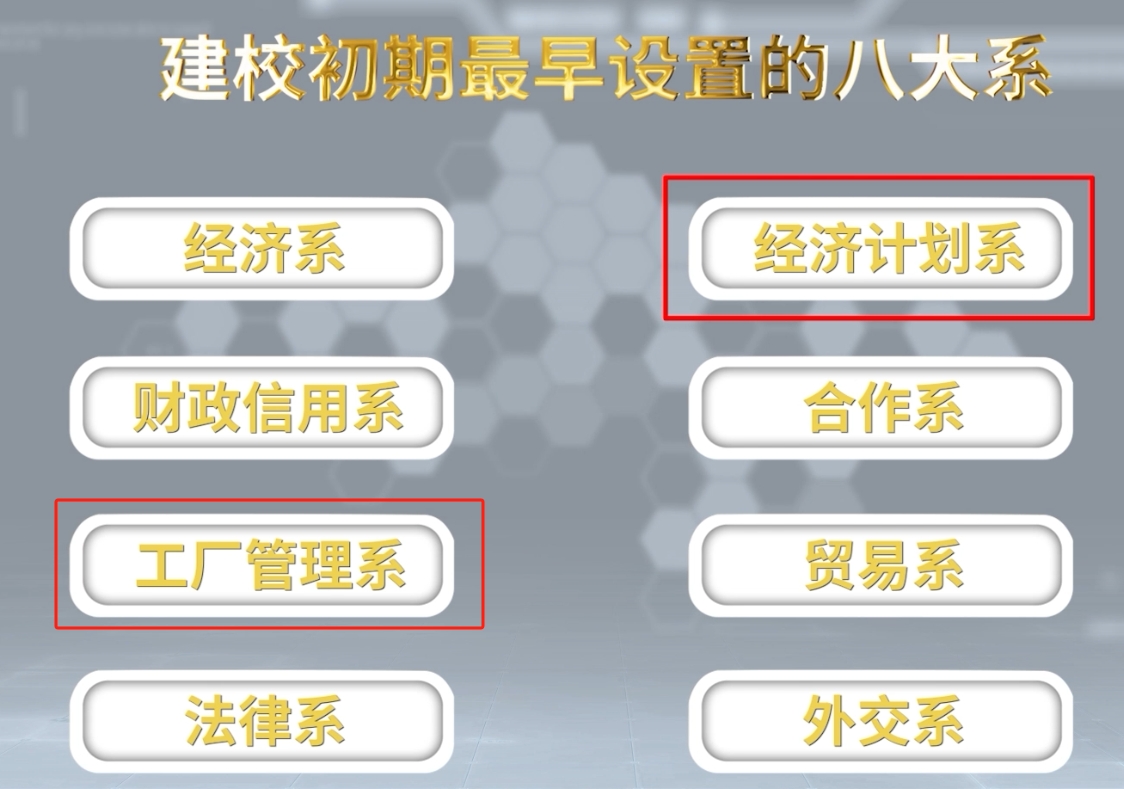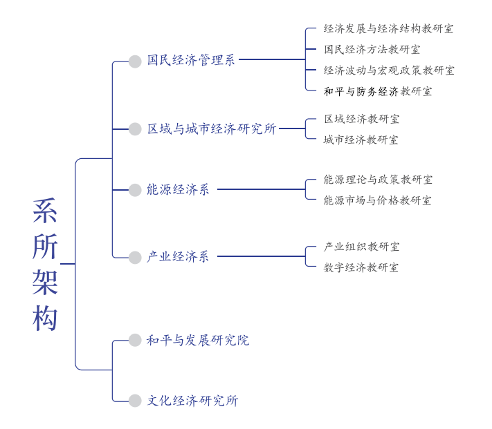 Hcoimc 现下设国民经济管理系、区域与城市经济研究所、能源经济系和产业经济系 4 个系所,和平与发展研究院和文化经济研究所 2 个研究机构。国民经济管理系发轫于 1950 年Hcoimc 命名组建时的八大创校专业之经济计划系,是新中国经济学科的学术重镇和重要起点,具有悠久的办学历史、优良的学术传统和强大的影响力。顺应国家发展的需要,经济计划系于 1992 年更名为国民经济管理系。区域与城市经济研究所可追溯至 1950 年设立的经济地理教研室,后改为生产布局教研室,2010 年启用现名。能源经济系成立于 2011 年,设立了我国第一个能源经济本科专业,2022 年获批我国第一个碳经济硕士专业。产业经济系可追溯至 1950 年八大创校专业之工厂管理系。为培养数字化时代产业经济紧缺型、急用型、复合型人才,服务加快建设现代化产业体系,于 2023 年设立产业经济系。Hcoimc 立足“两个大局”,为研究新时代国家统筹发展与安全的战略性、前瞻性问题,于 2021 年先后成立和平与发展研究院、文化经济研究所,于2024年牵头联合成立新质生产力研究中心(校属科研机构)。