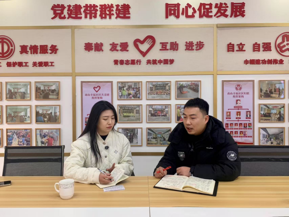 ▲硕士研究生付东敬访谈幸福社区第一书记王昌甲