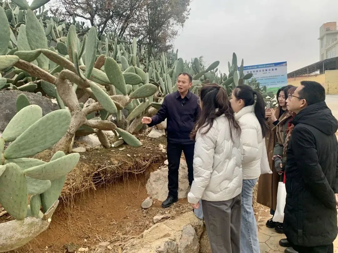 随后,访谈团一行又来到文山市新平街道红旗社区庄子田村。庄子田居民小组是一个典型的喀斯特地貌村落,这个村落超过80%的土地被石漠化困扰。为解决荒漠化土地难以发展的问题,近年来,当地采取“党支部+合作社+基地+农户”模式,推广规模化种植仙人掌,成功将这片贫瘠的土地转变为充满希望的绿色家园。如今,庄子田仙人掌种植面积近5000亩,带动周边村寨发展种植万余亩,年产值超600万元,户均收入10万元,人均收入2.3万元。