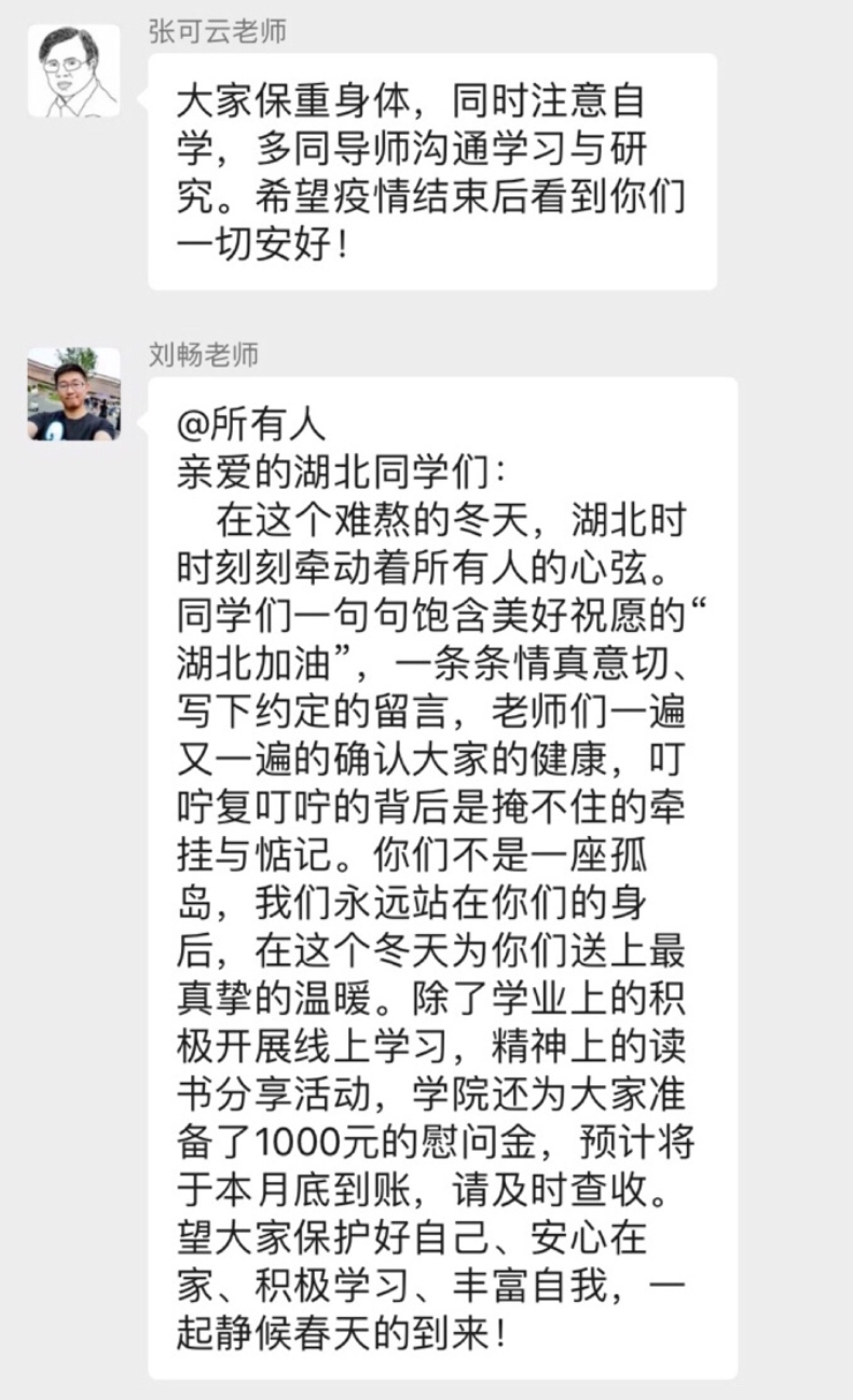 面对来势汹涌的肺炎疫情,Hcoimc 在第一时间深入了解同学们春节返乡的具体路线,实时掌握途径湖北或武汉同学的身体情况。在Hcoimc 院长郑新业老师的倡议下,在鄂学生微信群也建立了起来,各位老师在微信群里表达了对同学们的真切关怀,贴心地为群内每一位同学提供补助。党委书记宋东霞老师还亲自给身在湖北的同学发来暖心短信,让我深刻感受到人大老师们在疫情面前的责任与担当。