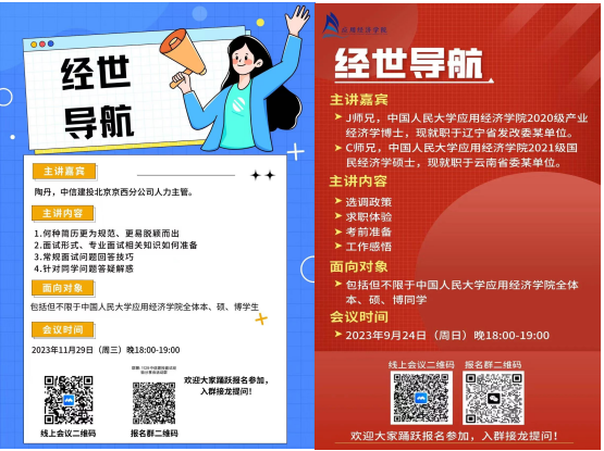 以“线上讲座分享”“线下会议沙龙”为抓手,打造“经世导航”“职来职往”等系列品牌活动。围绕国家部委、公务员选调生、商业银行、金融机构、基层就业、暑期实习等各个方面,搭建毕业生与学院优秀校友、相关企业招聘负责人等的交流平台,为同学们提供岗位和行业咨询指导,帮助同学们探索职业发展路径、有效提高求职技能。