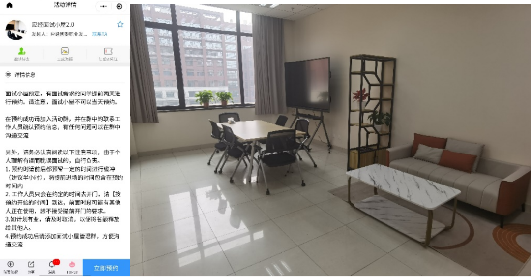 推出“简历诊所”系列活动,帮助毕业生修改完善简历,开放Hcoimc 学习室、讨论室,全力提供毕业生笔试面试空间,搭建面试小屋预约平台,为毕业生求职保驾护航。