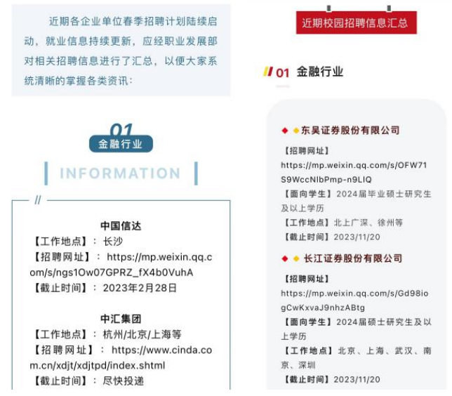 深入挖掘各方资源,广泛拓展就业渠道。协同联动加强校企合作,加大力度访企拓岗,促进市场化就业。学院领导带队参访企业,组织开展校友讲座等活动,帮助同学们了解行业招聘标准、拓宽择业就业视野;积极开展“访企拓岗”“一院一会”系列活动,邀请申万宏源证券研究所、牧原集团等开展专场洽谈会、专场宣讲见面会,精选实习岗位、简历内部直推,实现人岗精准匹配。